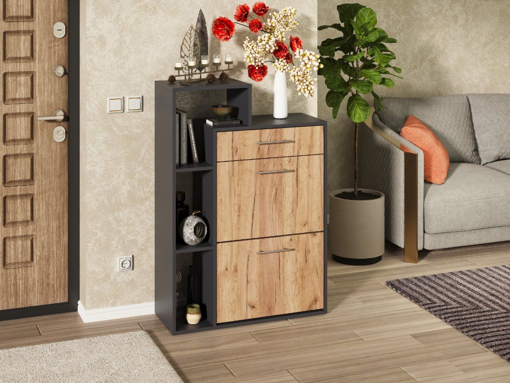 - Výklopný design: Umožňuje snadný přístup k obuvi, aniž byste museli botník otvírat úplně. To šetří čas i prostor!