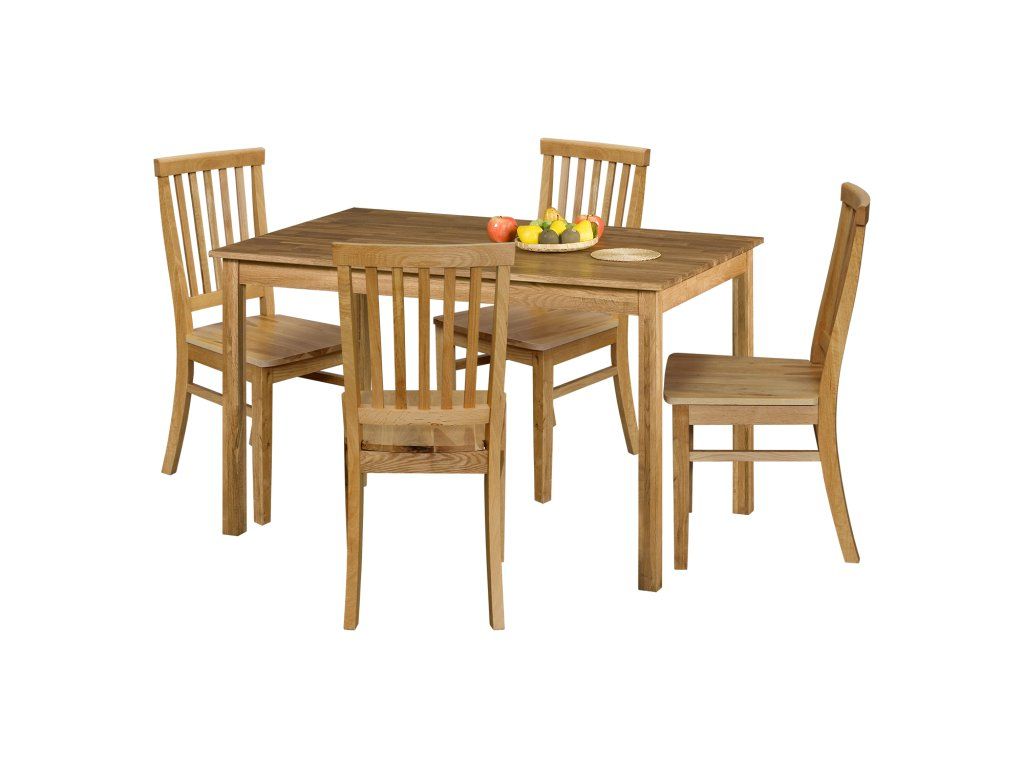 jidelní stůl 4840 a 4 jídelní židle 4842 stůl i židle materiál masiv dub, povrchová úprava olejovým mořením stůl možno doplnit jedním nebo dvěma výsuvnými díly 4841, výsuvné díly nejsou v ceně setu rozměr stolu (š/h/v) 120 × 80 × 75 cm rozměr židle (š/h/v) 44 × 44 × 92 cm, výška sedu 45 cm