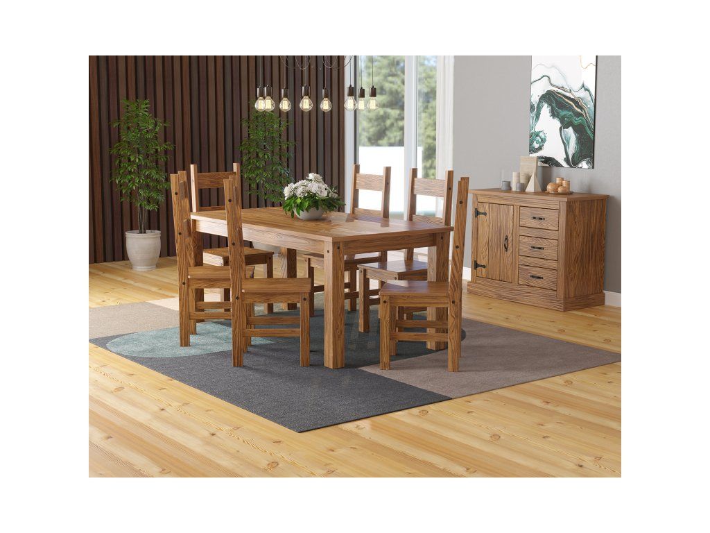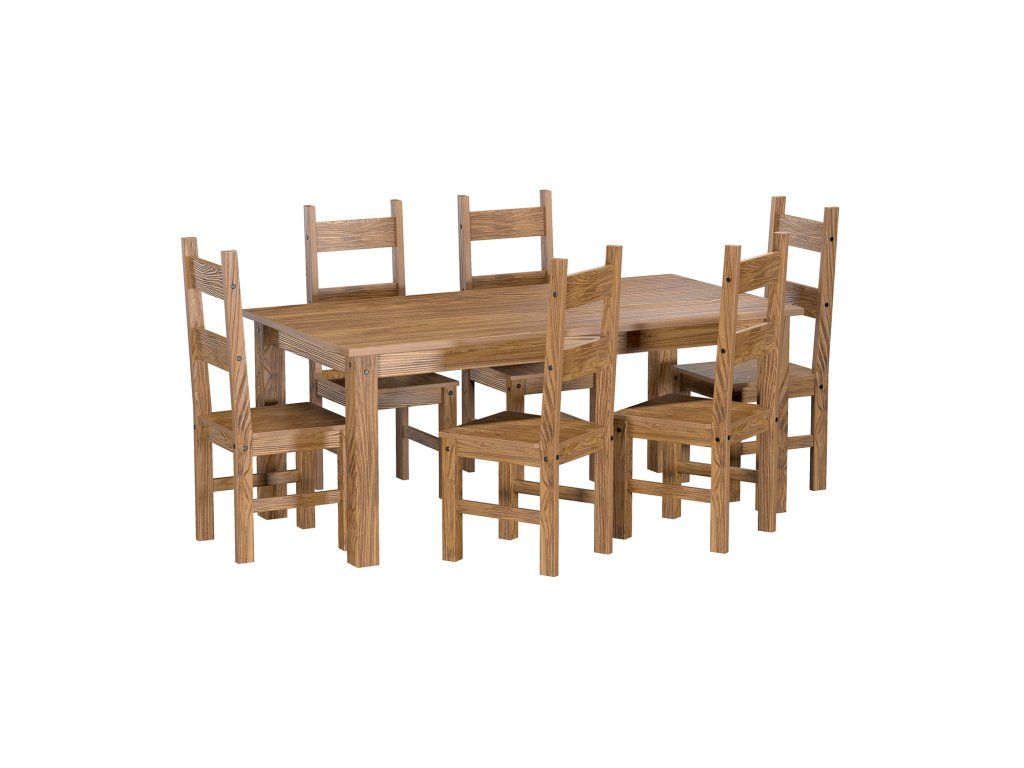 jidelní stůl 26813 a 6 jídelních židlí 26821 stůl i židle materiál masiv borovice, barevné provedení dub antik lakováno čirým lakem, vlis dřevěné struktury rozměr stolu (š/h/v) 178 × 92 × 76 cm rozměr židle (š/h/v) 43 × 49 × 107 cm součást sestavy EL DORADO