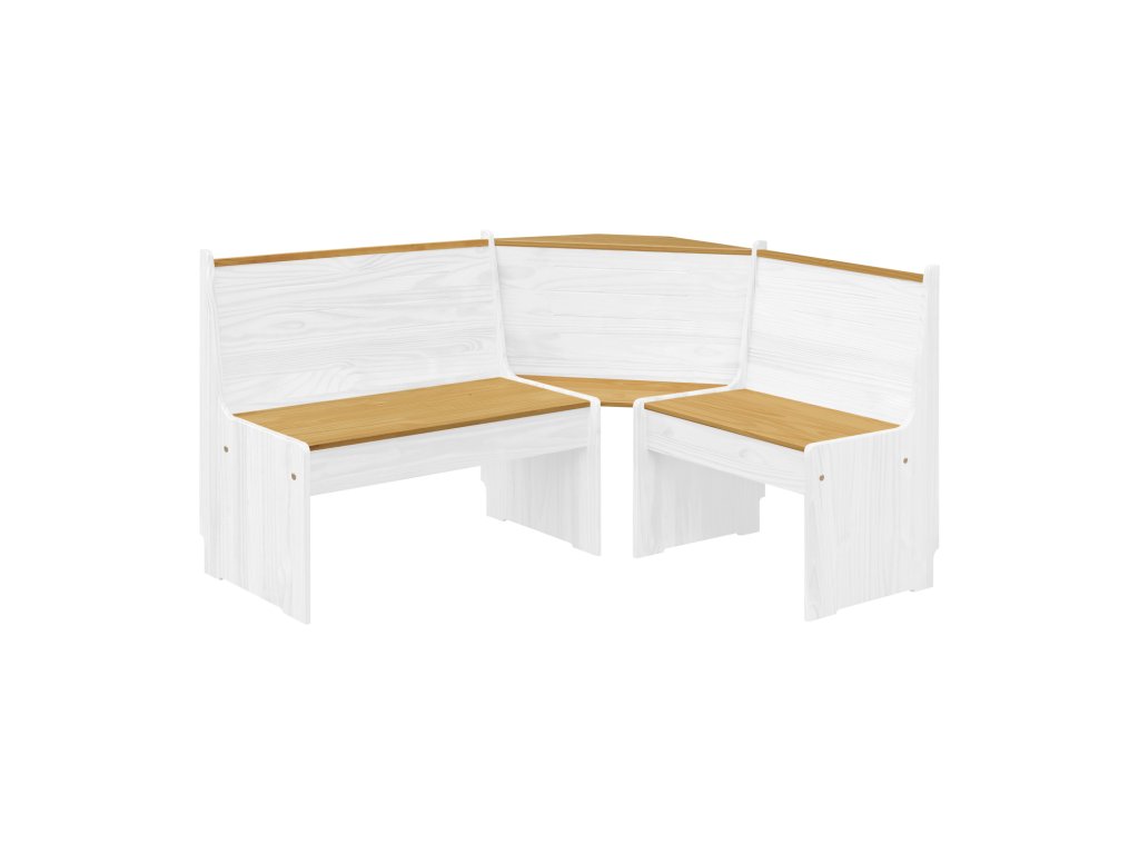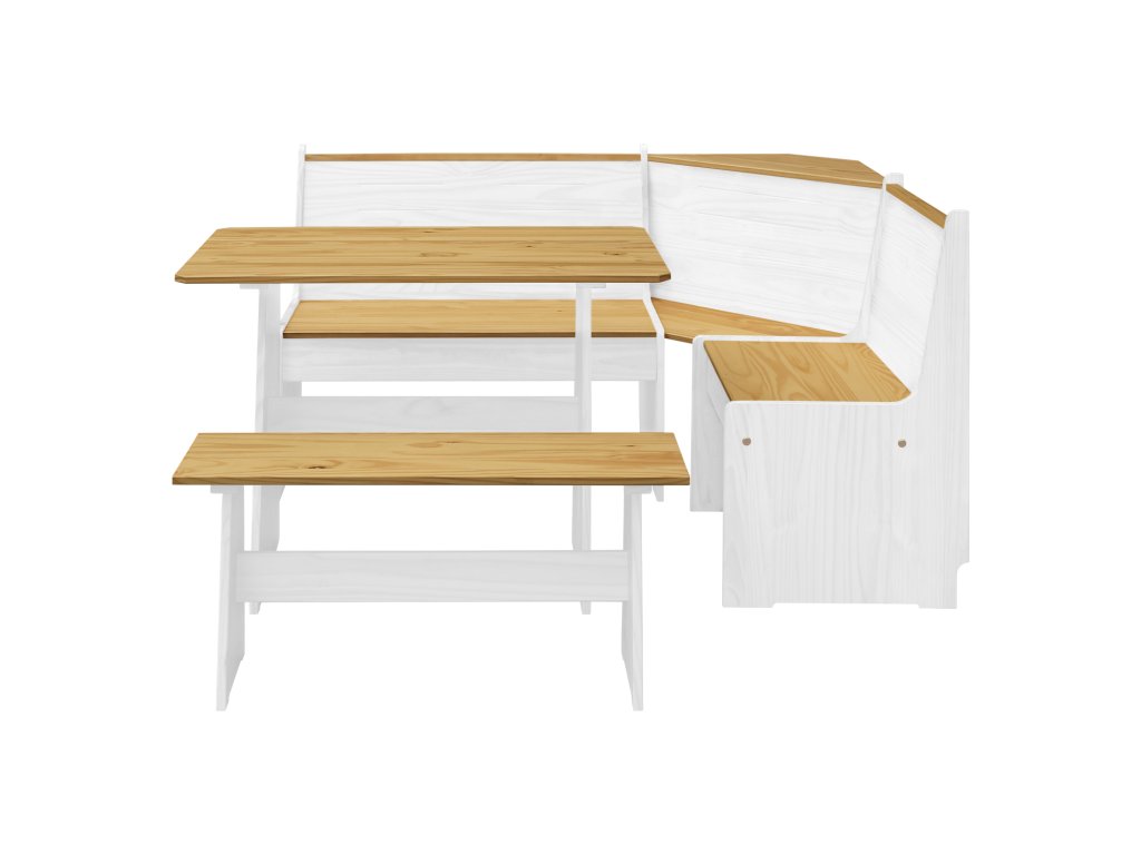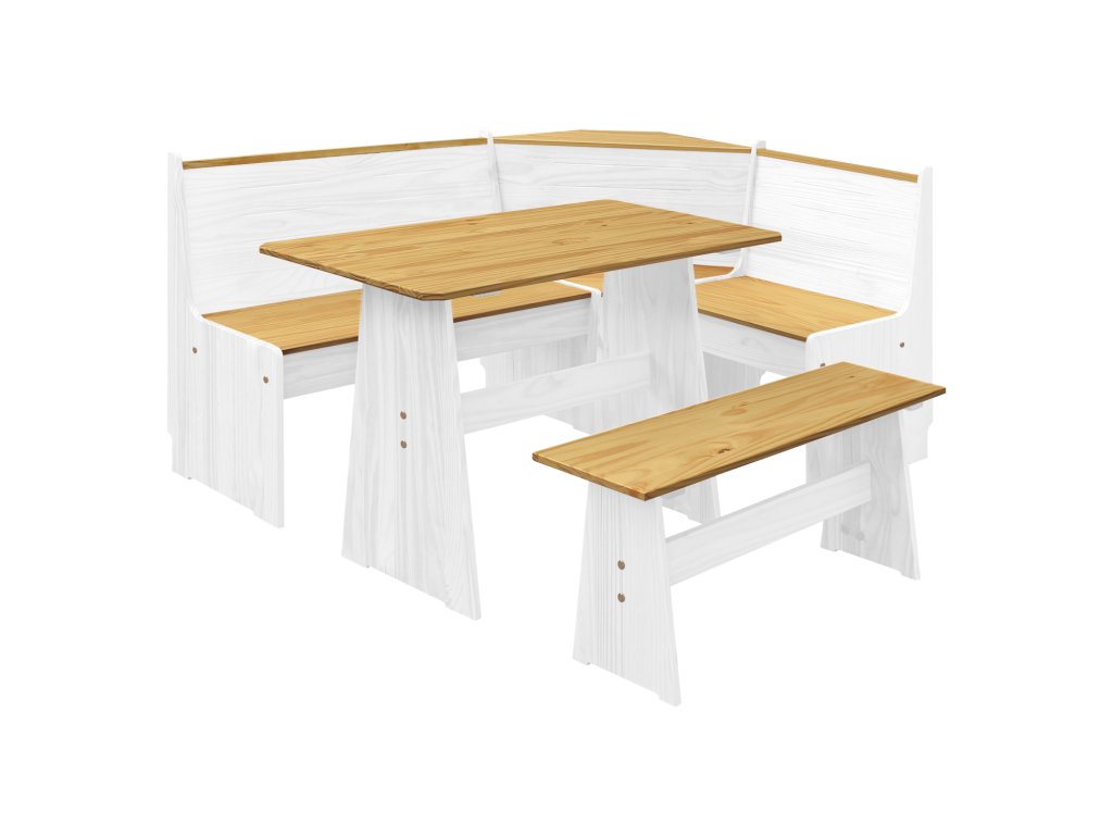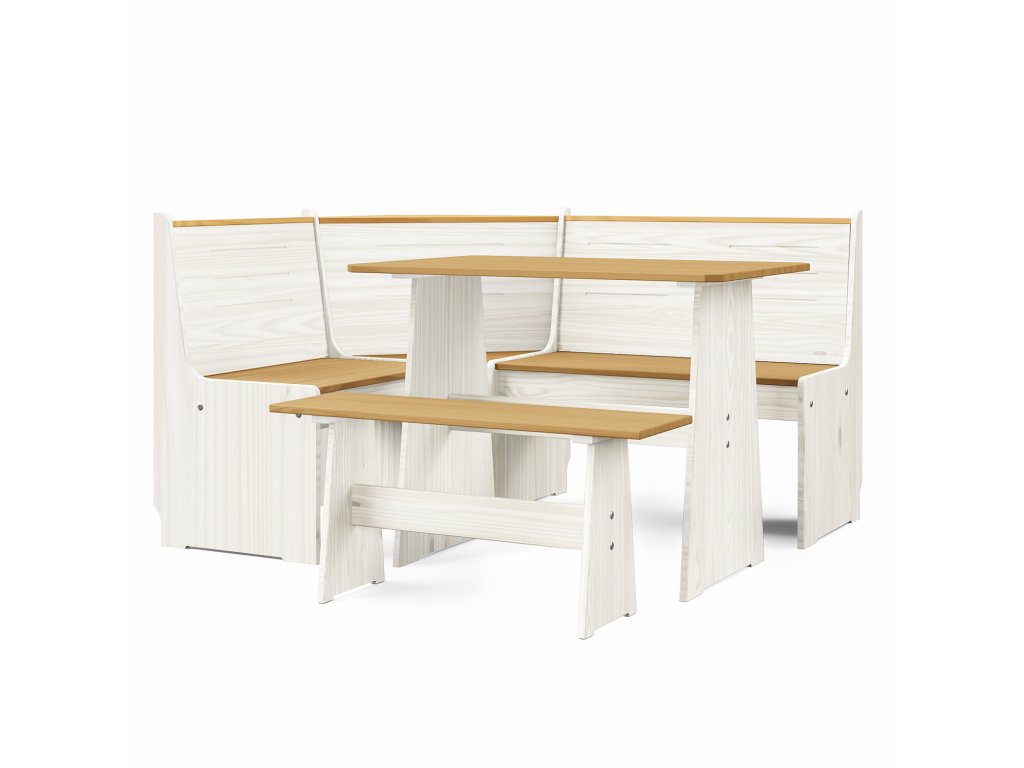 materiál masiv borovice, barevné provedení bílý / medový lak rohová lavice, stůl a lavice rozměr rohové lavice (š/h/v) 152/119 × 51 × 86 cm, výška sedu 43 cm hloubka sedu 39 cm, šířka sedu 91,5 cm širší část, 58,5 cm užší část rozměr stolu (š/h/v) 100 × 60 × 73 cm, rozměr lavice (š/h/v) 92 × 28 × 43 cm možnost sestavení na levou i pravou stranu