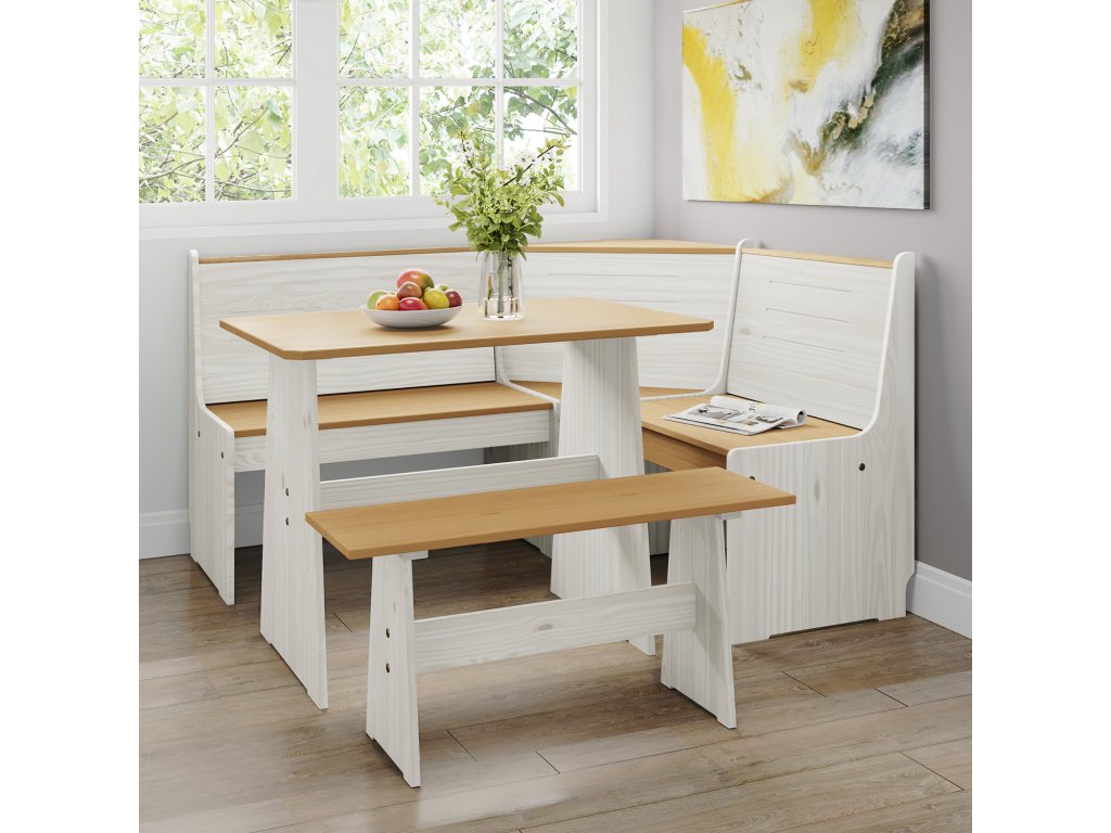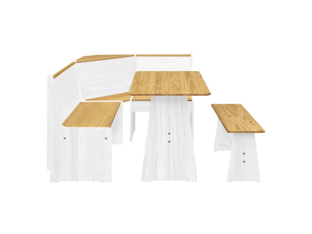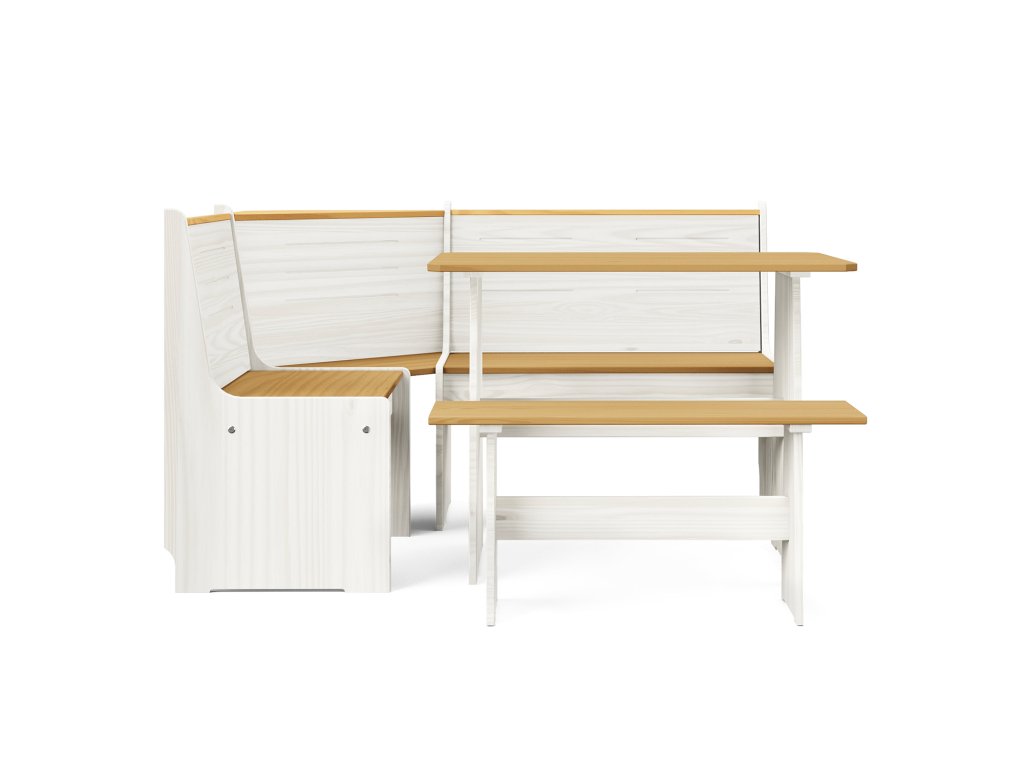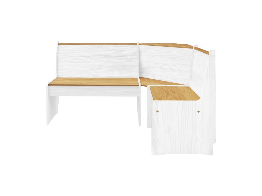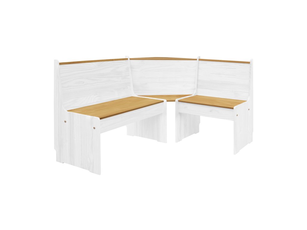 materiál masiv borovice, barevné provedení bílý / medový lak rohová lavice, stůl a lavice rozměr rohové lavice (š/h/v) 152/119 × 51 × 86 cm, výška sedu 43 cm hloubka sedu 39 cm, šířka sedu 91,5 cm širší část, 58,5 cm užší část rozměr stolu (š/h/v) 100 × 60 × 73 cm, rozměr lavice (š/h/v) 92 × 28 × 43 cm možnost sestavení na levou i pravou stranu