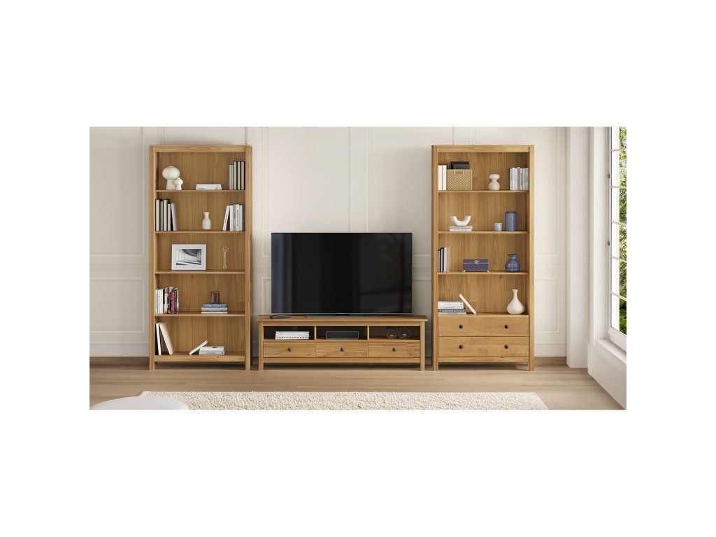 materiál masiv borovice voskovaná v medovém odstínu kovové úchytky v barevném provedení černěná mosaz tři police, dvě zásuvky s kovovými pojezdy