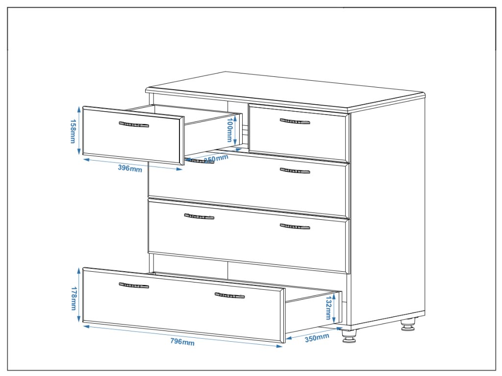Komoda je vybavena prostornými zásuvkami, které poskytují dostatek úložného prostoru pro různé předměty. Dostupná je v několika atraktivních barevných provedeních, jako je bílá, dub sonoma, wenge, dub kraft, lískový ořech a dub truffle, což umožňuje snadné sladění s vaším interiérem.