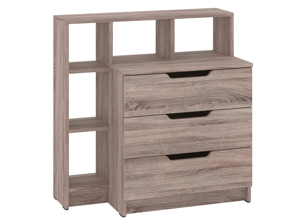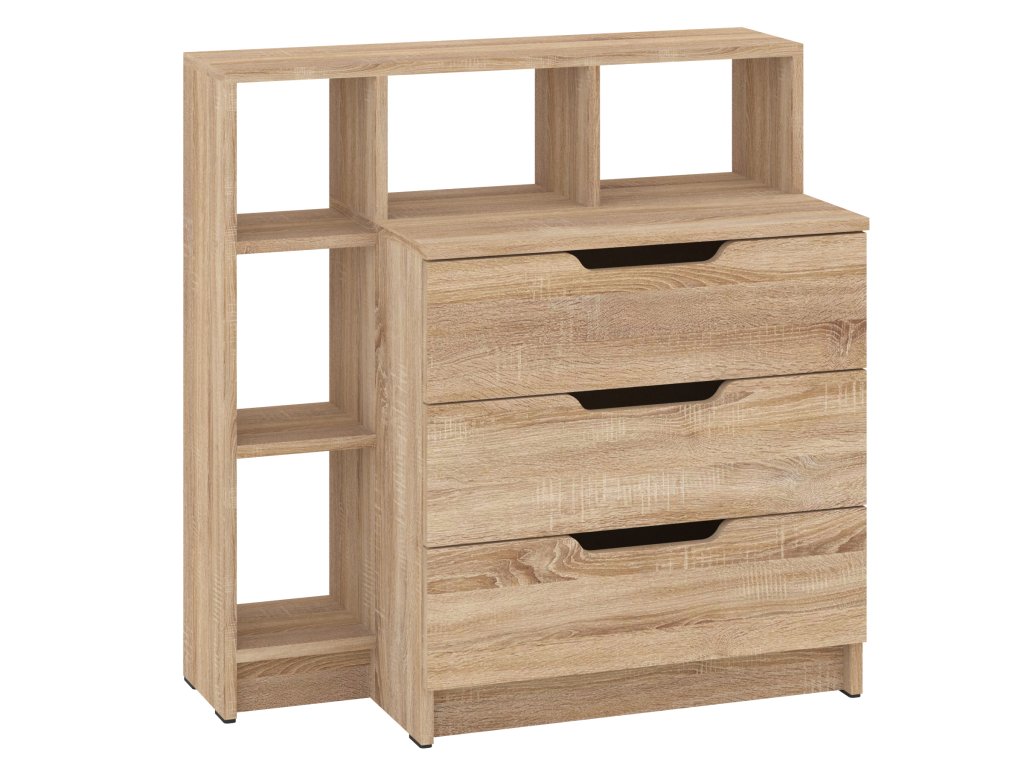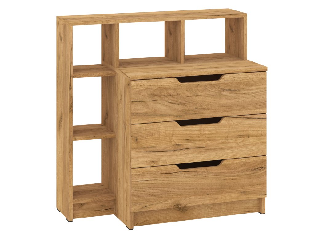 Komoda K-3+5 je stylový a praktický kus nábytku, který vyniká nejen svou funkčností, ale i moderním designem. Vyrobená z kvalitního lamina o tloušťce 16 mm, tato komoda nabízí vysokou odolnost a dlouhou životnost, což ji činí ideální volbou pro každou domácnost. Její kompaktní rozměry (výška 82 cm, šířka 80 cm, hloubka 40 cm) umožňují snadné umístění i do menších prostorů, aniž by ztratila na praktičnosti.
