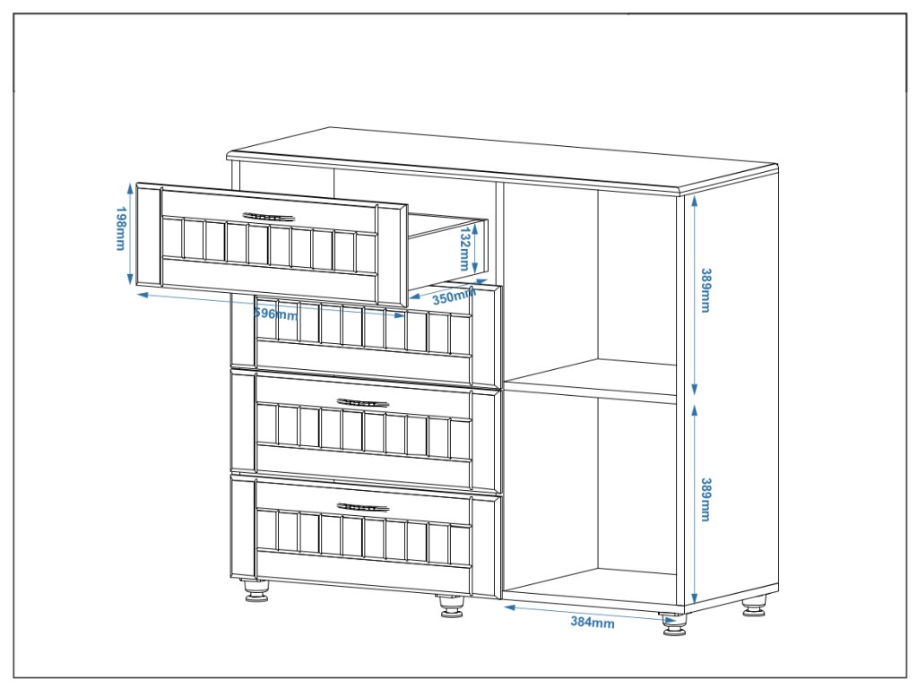 - Praktický úložný prostor – 4 zásuvky a skříňka pro pohodlné uskladnění.