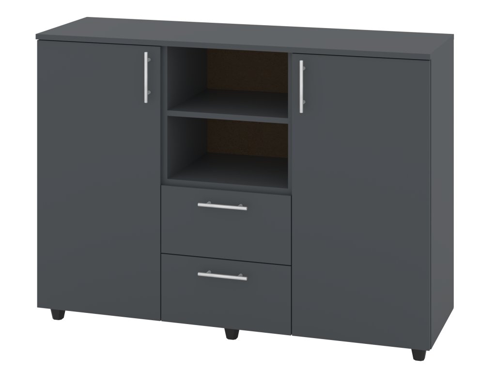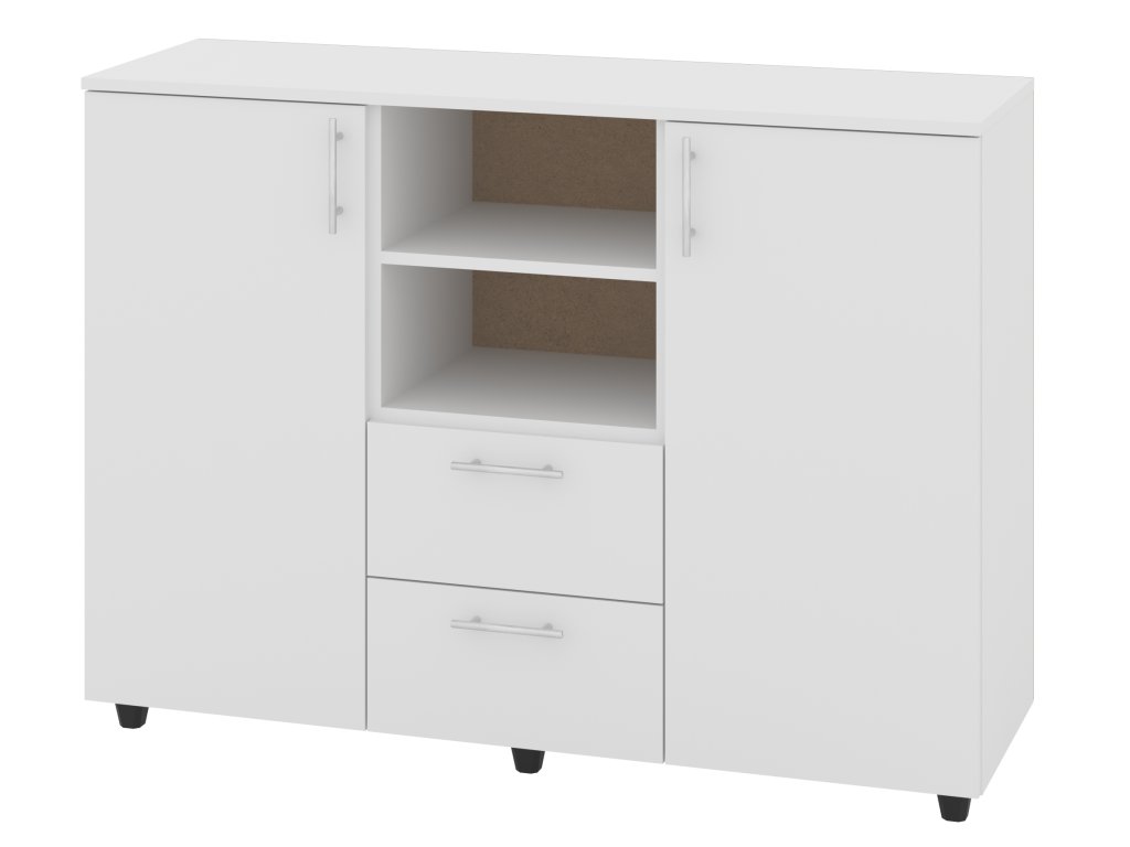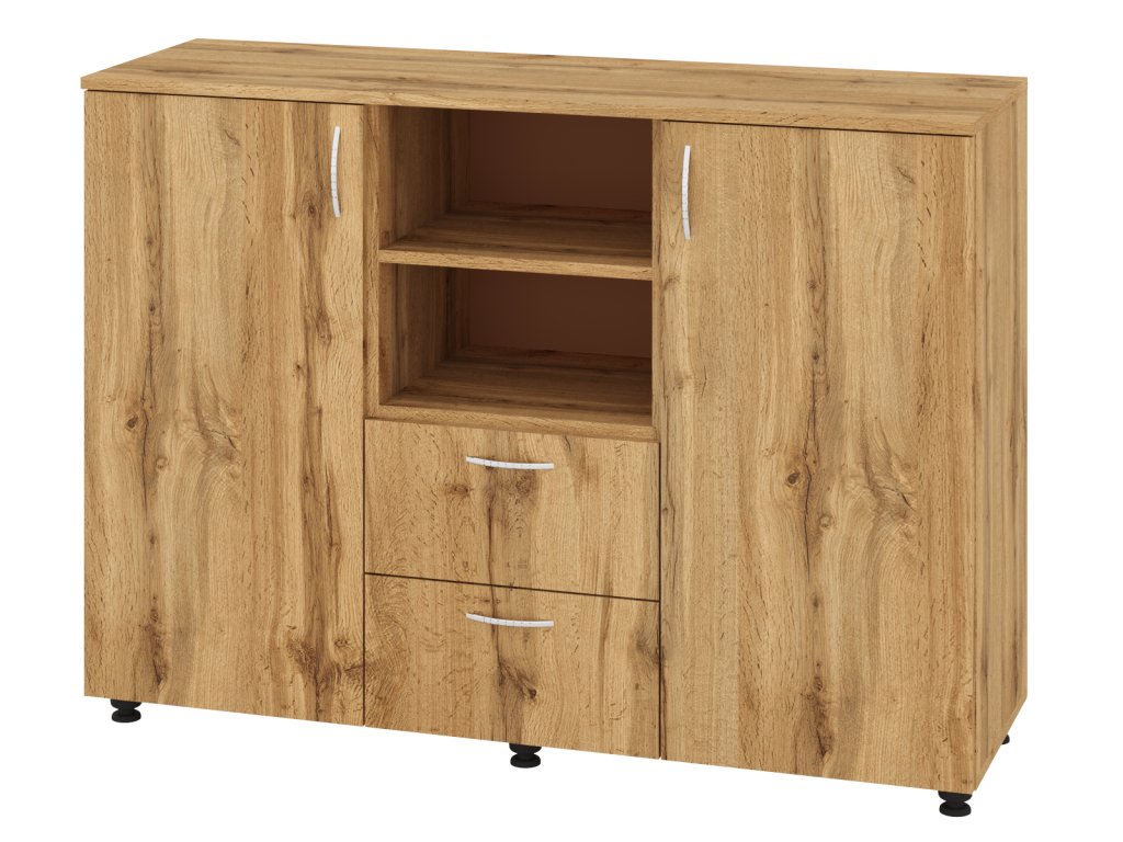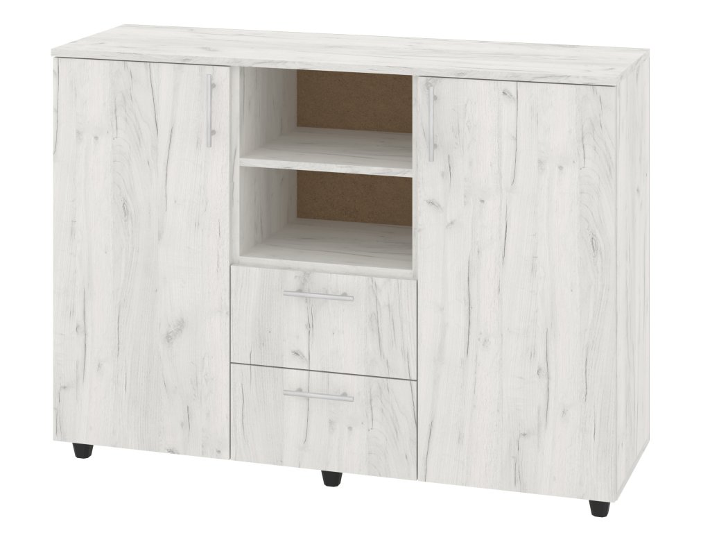 - Praktický design: Komoda je vybavena dvěma zásuvkami, dvěma dvířky a otevřenou policí, což umožňuje efektivní využití prostoru a snadné uspořádání věcí.
