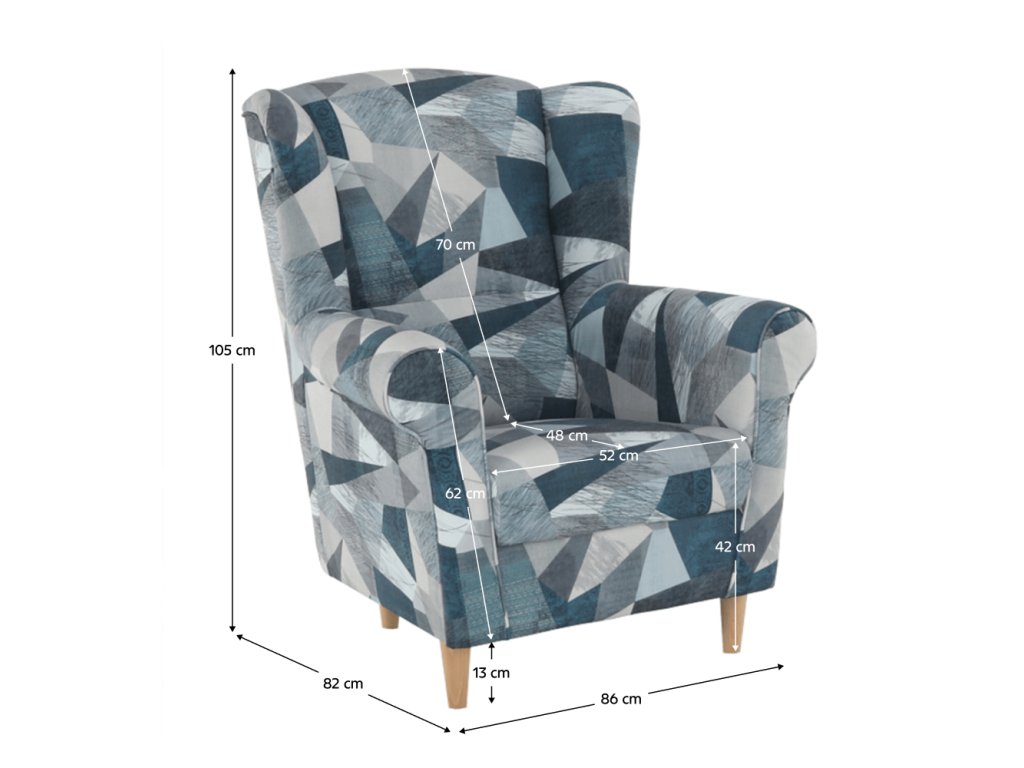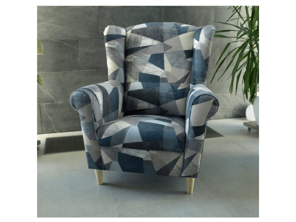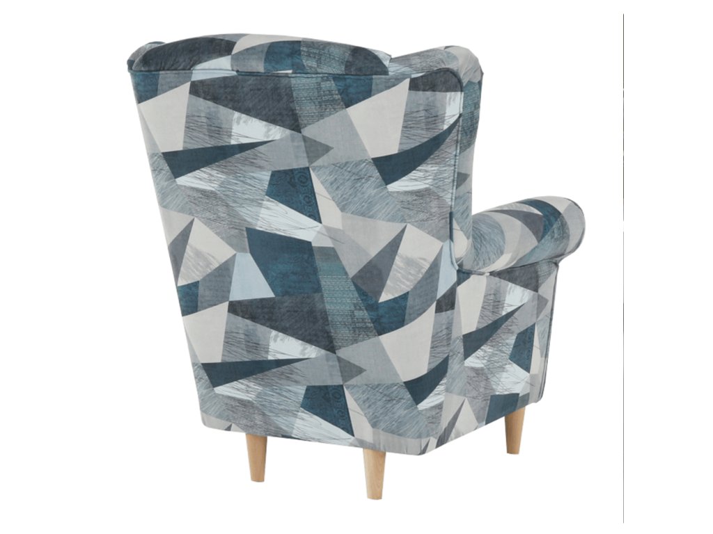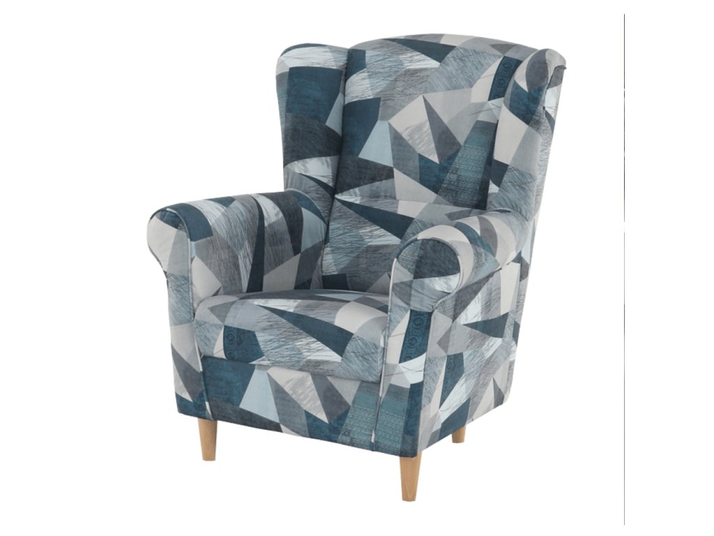 Křeslo-ušák CHARLOT v barevném provedení látky Holm šedomodrý vzor.