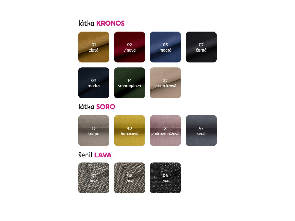 Možnost objednání ve vyobrazených barevných provedeních látek: Savana, Kronos, Soro, Lava v cene 3.250 Kč, v látce Coral Boucle v ceně 2.950 Kč, v mikrofázi za cenu 2.790 Kč, v ekokůži a v kombinaci ekokůže+látka Lava za cenu 3.290 Kč. Při individuální objednávce je třeba zaplatit 20% zálohu z dané částky. Po uhrazení zálohy bude Vaša objednávka zadána do výroby. Dodací lhůta 6-8 týdnů.