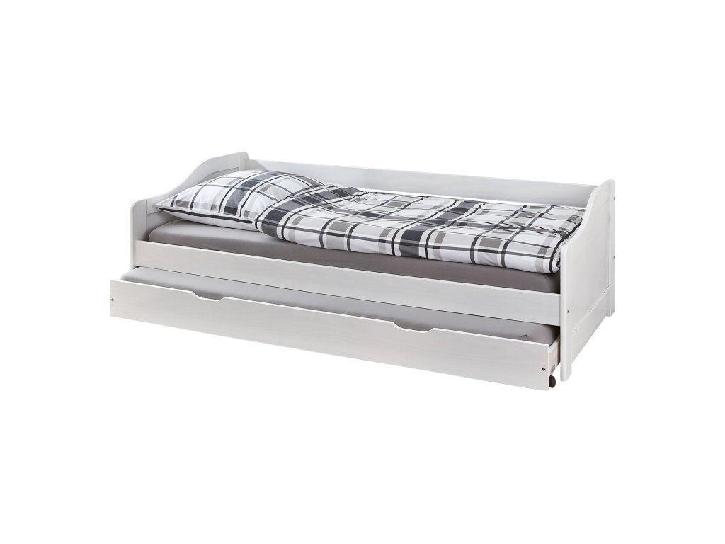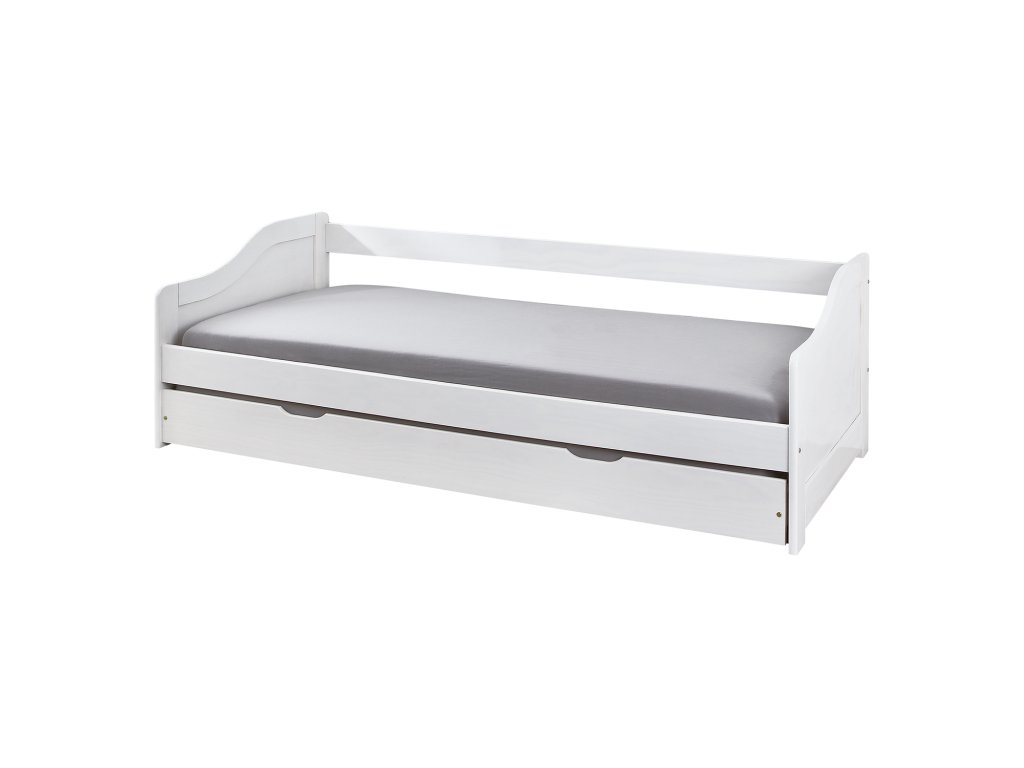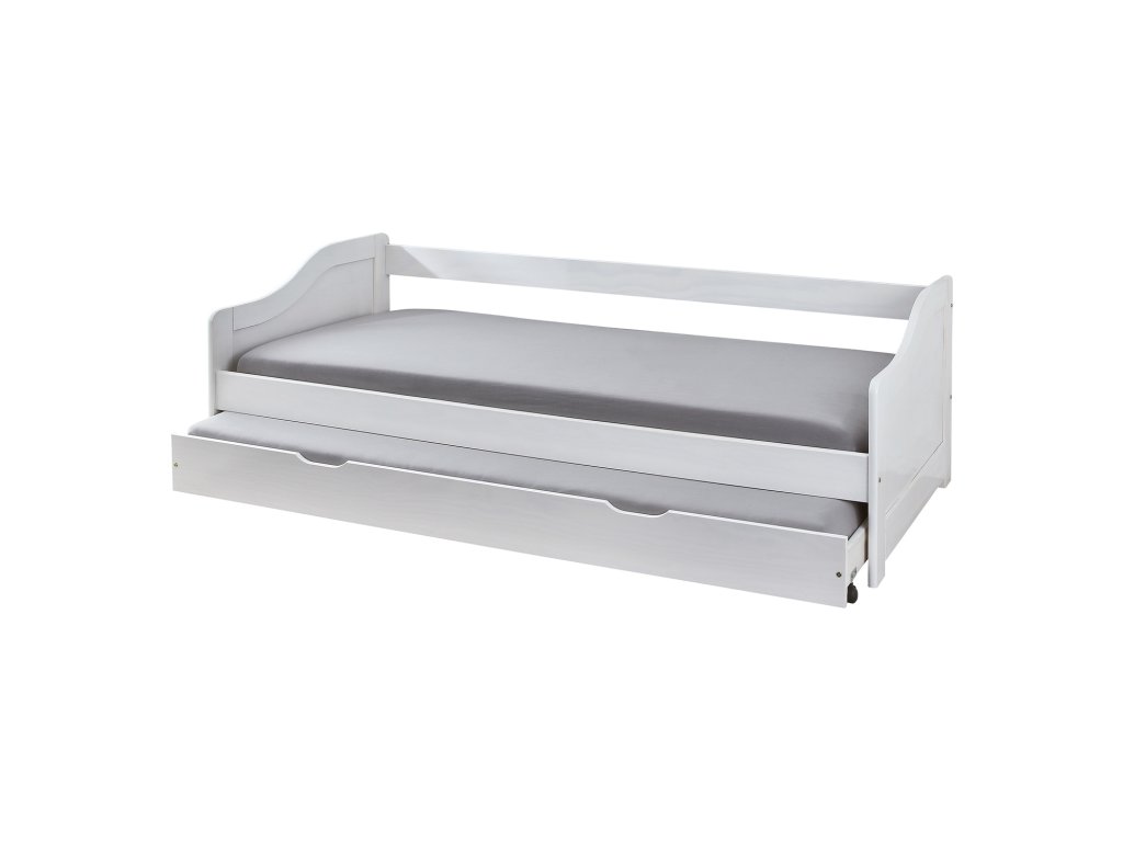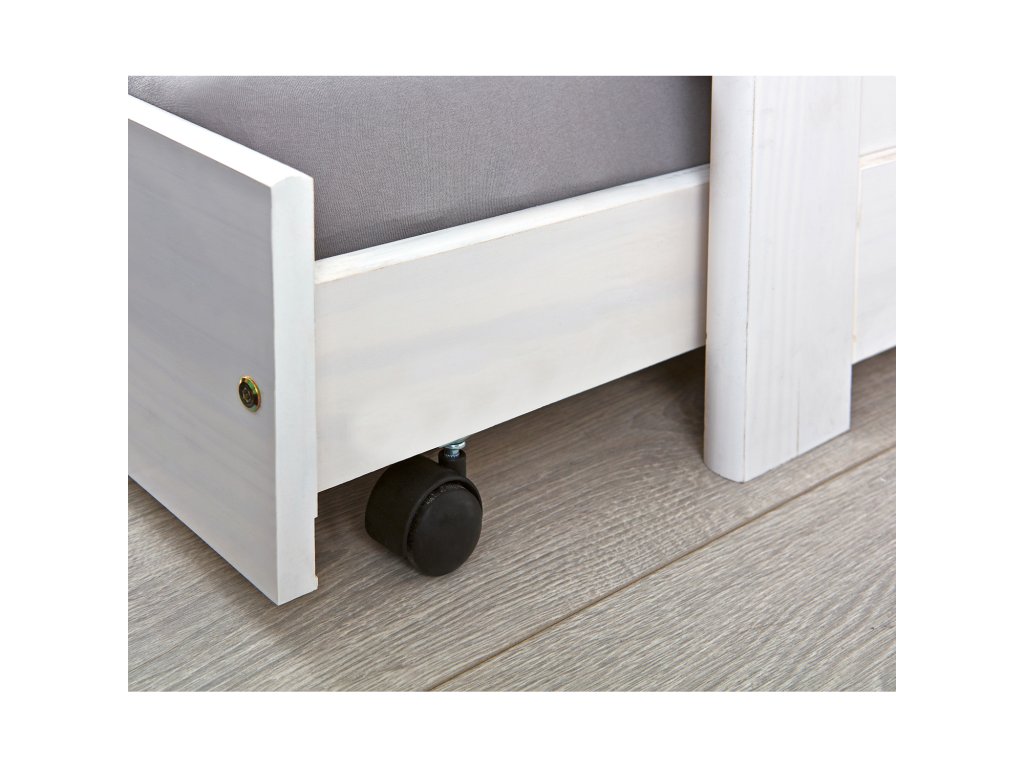 materiál masiv borovice, barevné provedení bílý lak výška sedu postele 37 cm dřevěné laťkové rošty jsou v ceně, matrace nejsou v ceně výsuv možno využít jako úložný prostor nebo jako přistýlku doporučená výška matrace pro přistýlku 10 cm doporučený rozměr matrací 90 × 200 cm Leonie ID20900215