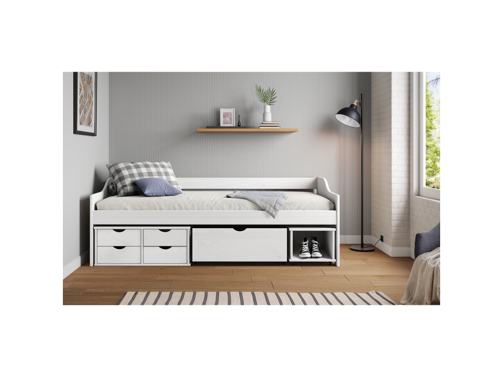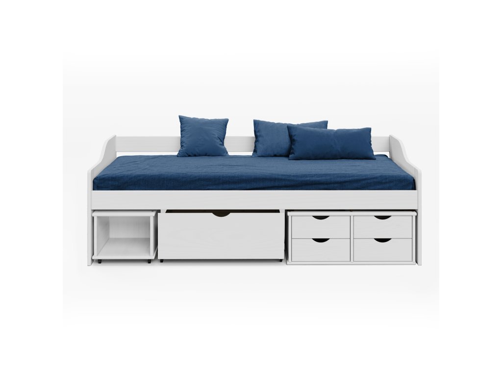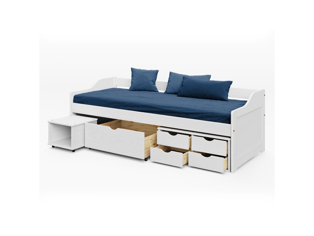 materiál masiv borovice, barevné provedení bílý lak praktické úložné prostory pod postelí (zásuvky a otevřená police) v ceně výška sedu 50 cm, cena včetně roštu (dřevěný laťkový), matrace není v ceně doporučený rozměr matrace 90 × 200 cm (M2, M5, M9, M12, M24, M26) jako vhodný doplněk doporučujeme čalouněný válec M10 hloubka široké zásuvky 65,5 cm, hloubka malých zásuvek 39 cm, hloubka otevřené police 44,5 cm