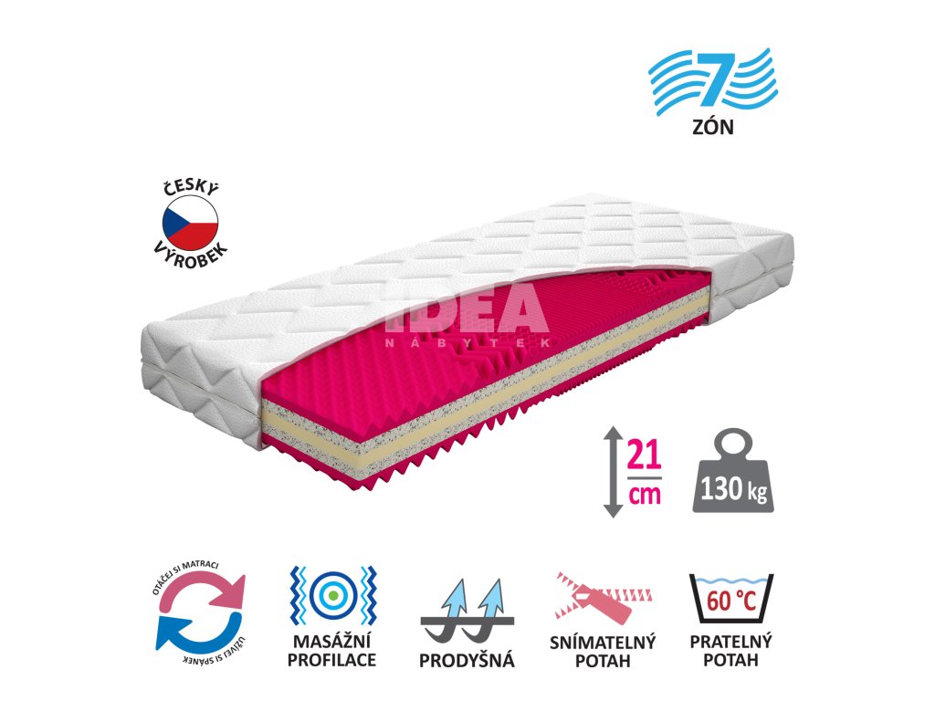 oboustranná sendvičová matrace s jádrem z pěti vrstev pěn poskládaných tak, aby podporovaly tělo a páteř při spánku rozdílná tuhost pěn na ložních plochách umožňuje výběr měkčí nebo tvrdší strany jedna ložná plocha je ze studené pěny CoolFlex® FLEXI, která vyniká dlouhou živostností, elasticitou a tvarovou stálostí, druhá ložná plocha je z kvalitní polyuretanové pěny obě strany – 7zónová anatomická profilace, která umožňuje provzdušnění lůžka a napomáhá uvolnění svalstva pro vyšší nosnost matrace je jádro vyrobeno z pojeného polyuretanu RE a PUR pěny rozdílná tuhost stran (3 z 5 / 4 z 5) doporučené uložení na pevný i polohovací lamelový rošt potah snímatelný a pratelný do 60 °C doporučená nosnost do 130 kg, výška matrace 19 cm, výška jádra 18 cm