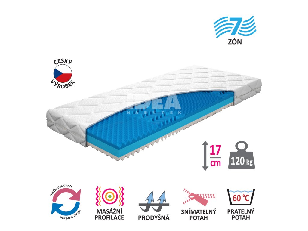 oboustranná partnerská sendvičová matrace z velmi kvalitních polyuretanových pěn s vyšší objemovou hmotností obě strany – 7zónová anatomická profilace, která umožňuje provzdušnění lůžka a napomáhá uvolnění svalstva rozdílná tuhost stran (2 z 5 / 4 z 5) doporučené uložení na pevný i polohovací lamelový rošt potah snímatelný a pratelný do 60 °C doporučená nosnost do 120 kg, výška matrace 17 cm, výška jádra 16 cm