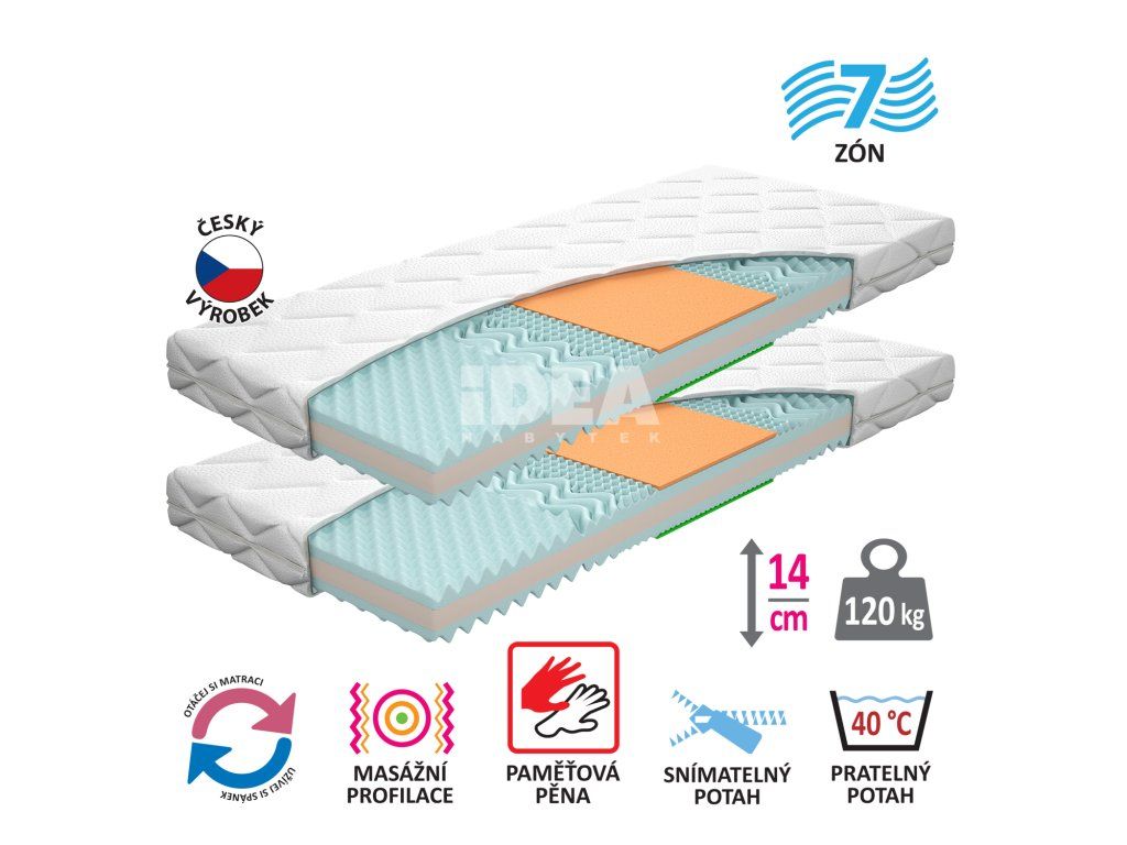 dvě matrace za cenu jedné paměťová pěna různých tuhostí v pánevních zónách pro odlehčení kloubům a celému pohybovému aparátu 7zónová anatomická masážní profilace přináší velmi jemnou masáž v průběhu spánku matrace s Visco pěnou a systémem rozdílné tuhosti stran vhodná pro všechny typy roštů potah snímatelný a pratelný do 40 °C doporučená nostnost do 120 kg