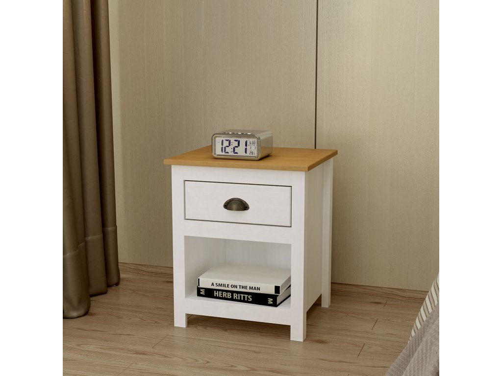 materiál masiv borovice, barevné provedení bílý / hnědý lak jedna zásuvka s kovovou úchytkou a pojezdy, jedna police
