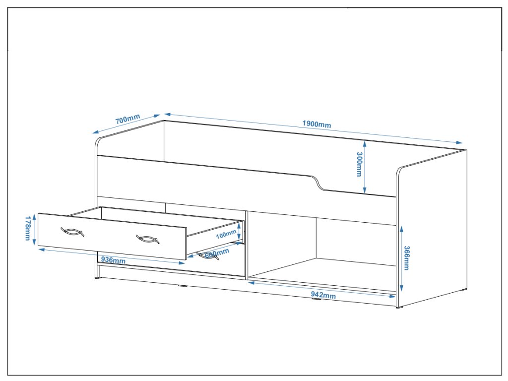 Praktické zásuvky a komoda – Postel má integrované zásuvky a komodu, což znamená, že budete mít dostatek úložného prostoru na hračky, oblečení nebo jiné nezbytnosti. Váš pokoj bude vždy uklizený a organizovaný.