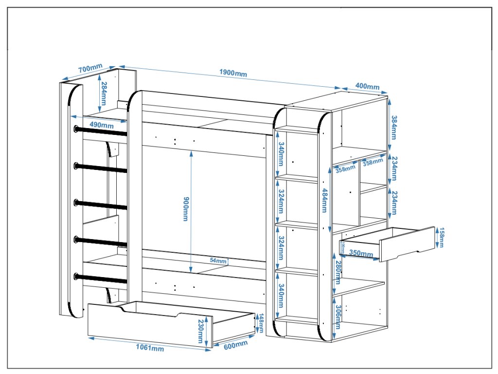 - Praktické úložné prostory: Regály, skříňka a zásuvka jsou skvélé pro organizaci hraček, knih nebo oblečení. Udržujte pokoj čistý a uklizený.