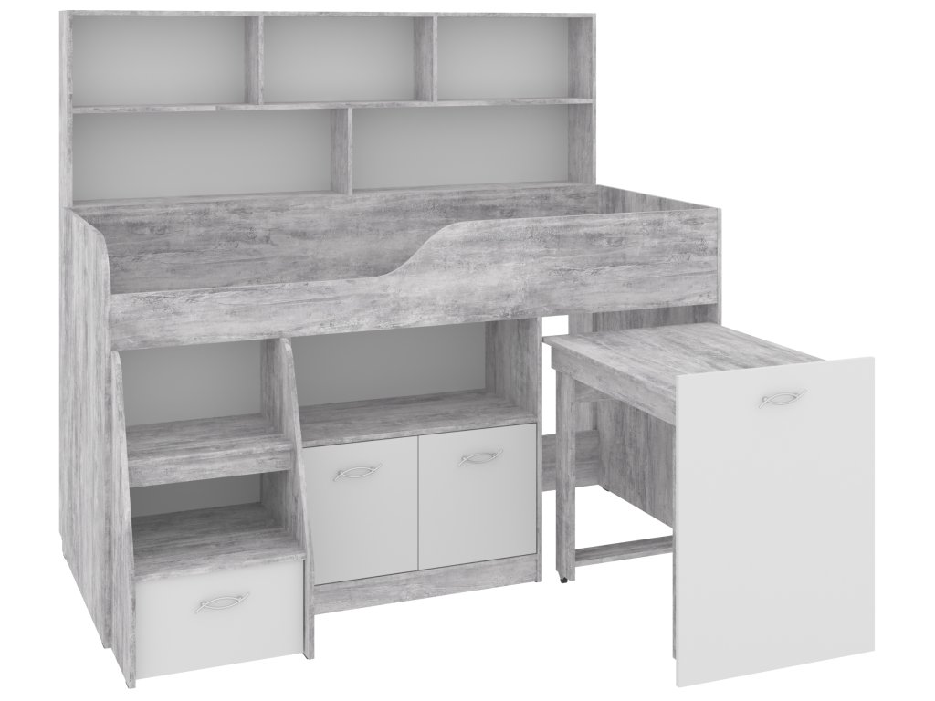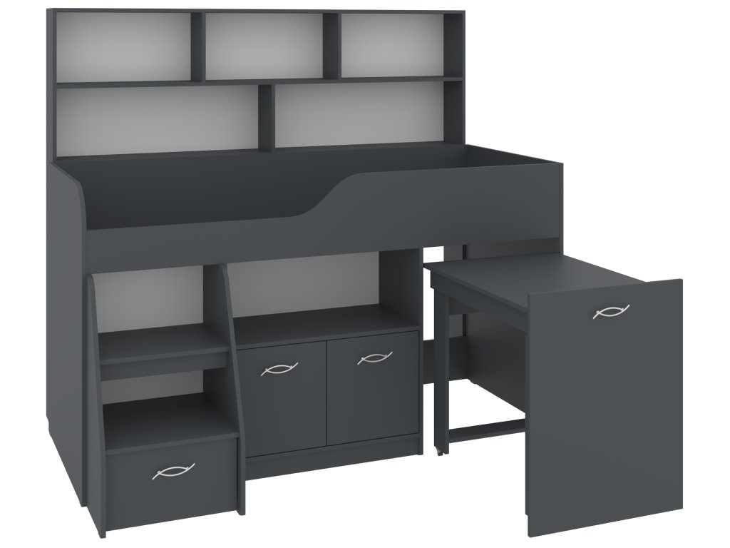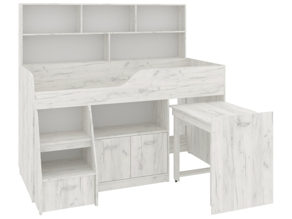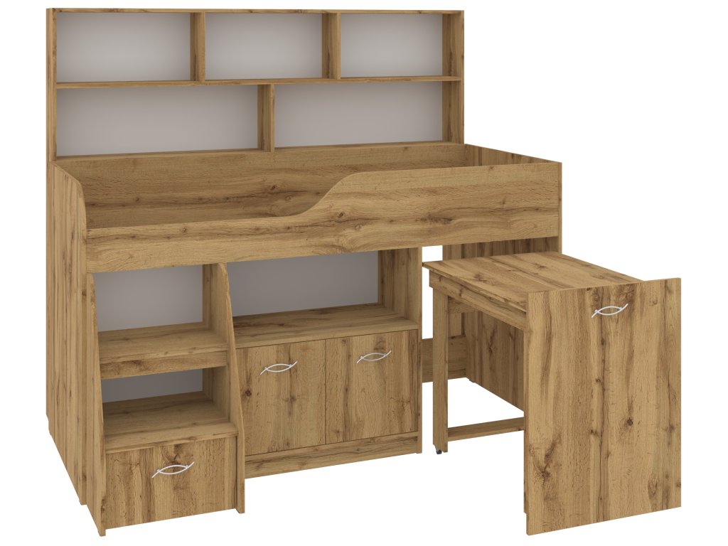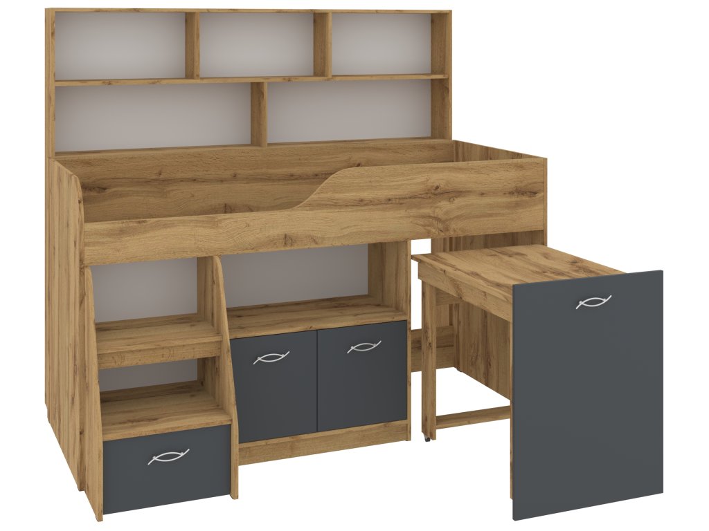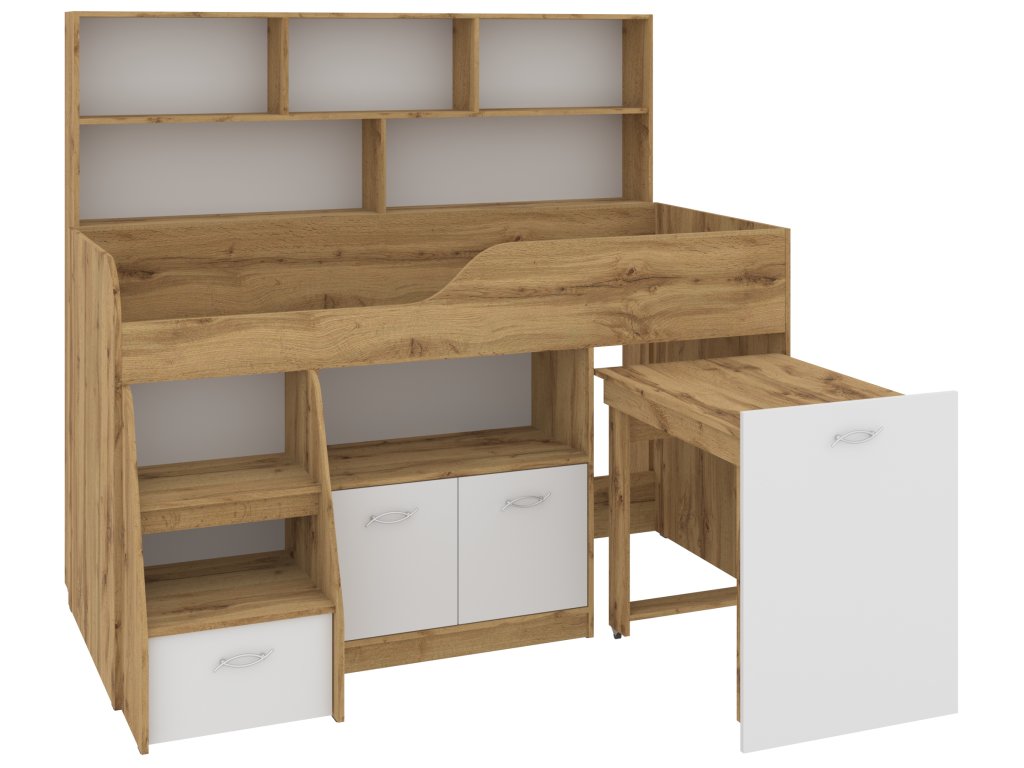 Výsuvný psací stůl, který je součástí postele, zaručí vašemu dítěti pohodlné místo pro učení, kreslení nebo hraní. Pod postelí se nachází skříňka a prostorná zásuvka, které nabízejí spoustu úložného prostoru pro knihy, hračky nebo oblečení. K tomu všemu přidává policový regál, který pomůže uspořádat vše potřebné.