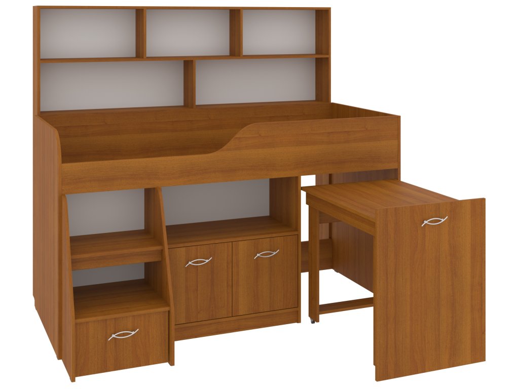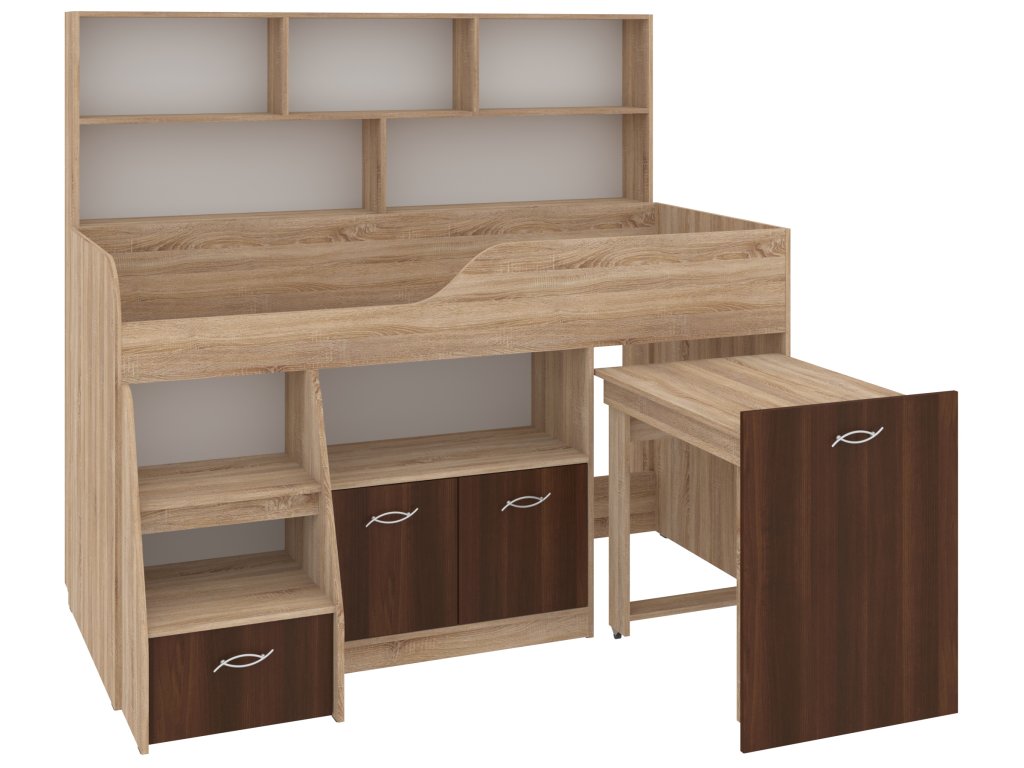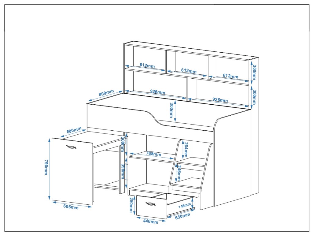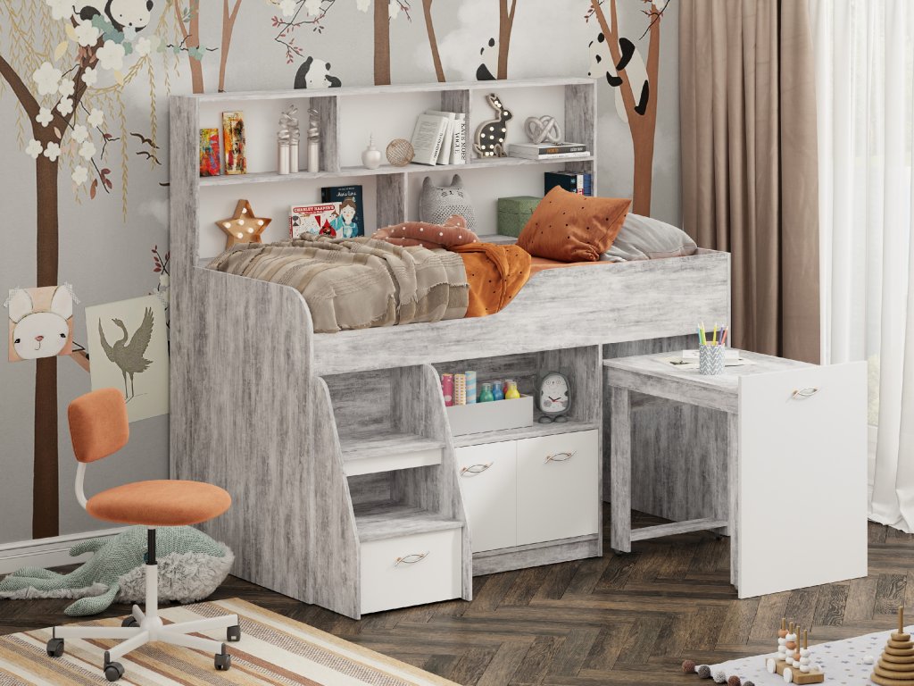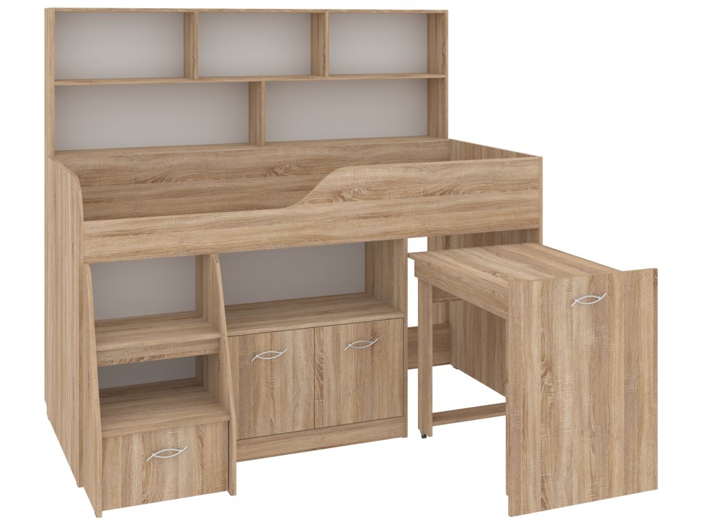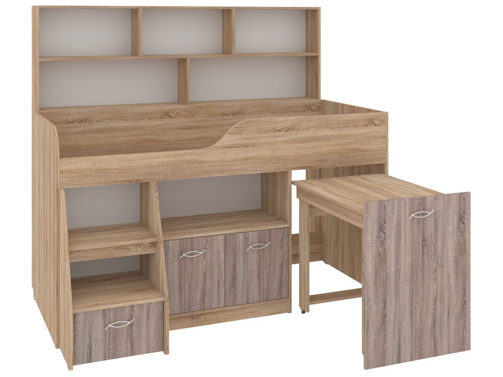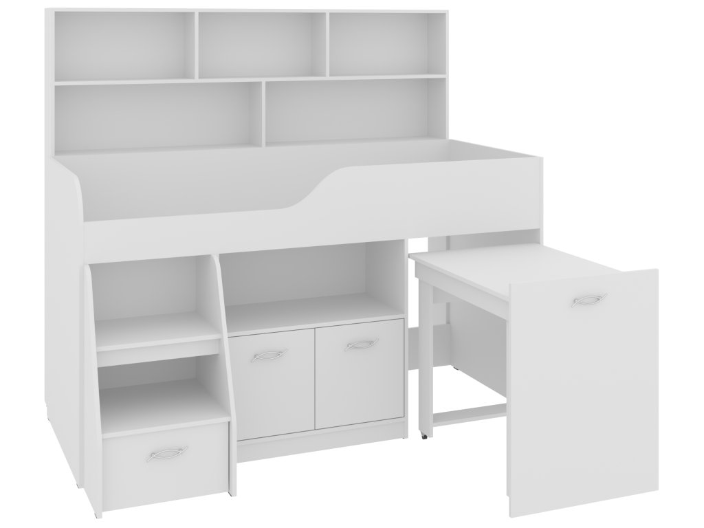 Výsuvný psací stůl, který je součástí postele, zaručí vašemu dítěti pohodlné místo pro učení, kreslení nebo hraní. Pod postelí se nachází skříňka a prostorná zásuvka, které nabízejí spoustu úložného prostoru pro knihy, hračky nebo oblečení. K tomu všemu přidává policový regál, který pomůže uspořádat vše potřebné.