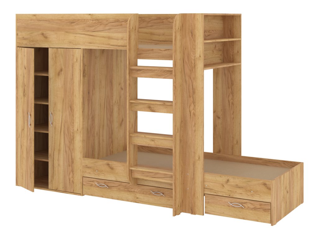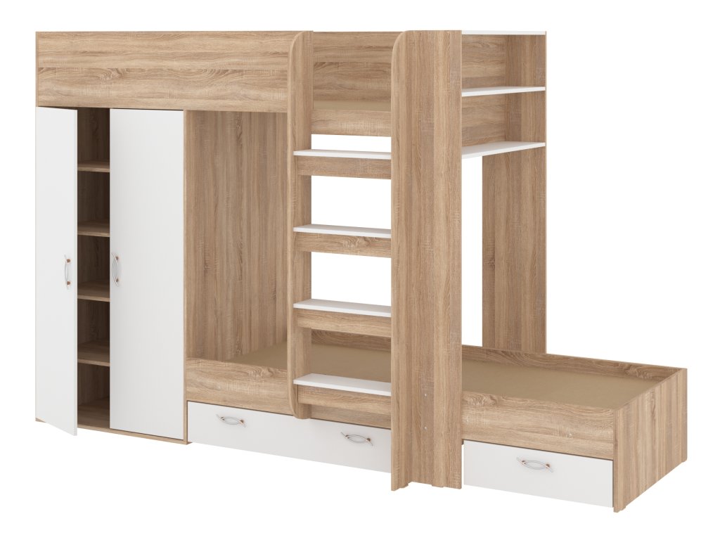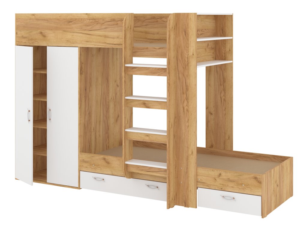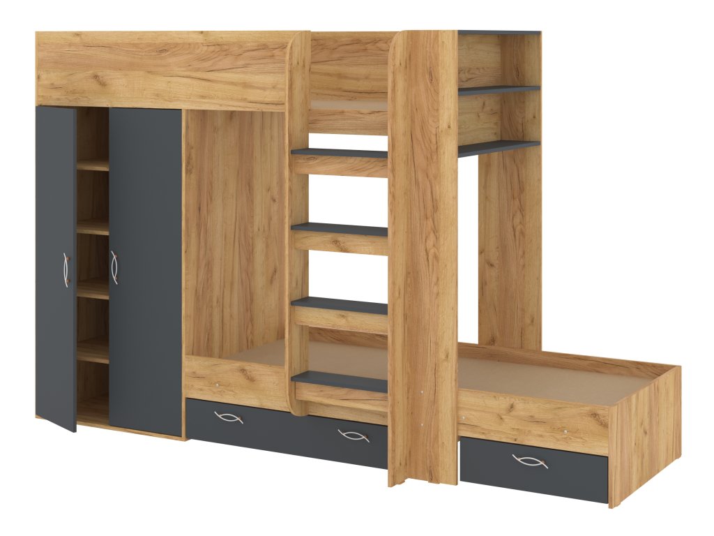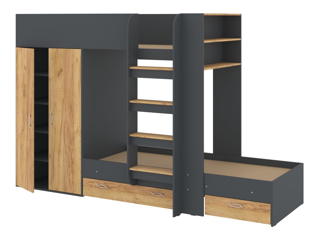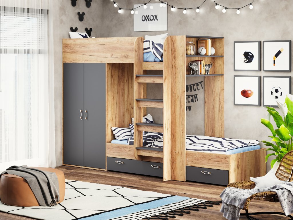 Hledáte praktické a stylové řešení pro dětský pokoj? Dětská patrová postel NEMO je ideálním nábytkem pro každý pokoj, kde potřebujete maximálně využít prostor. Tato postel nabízí více než jen místo pro spánek – obsahuje i šatní skříň a policový regál, čímž šetří místo a zajišťuje perfektní organizaci pokoje.