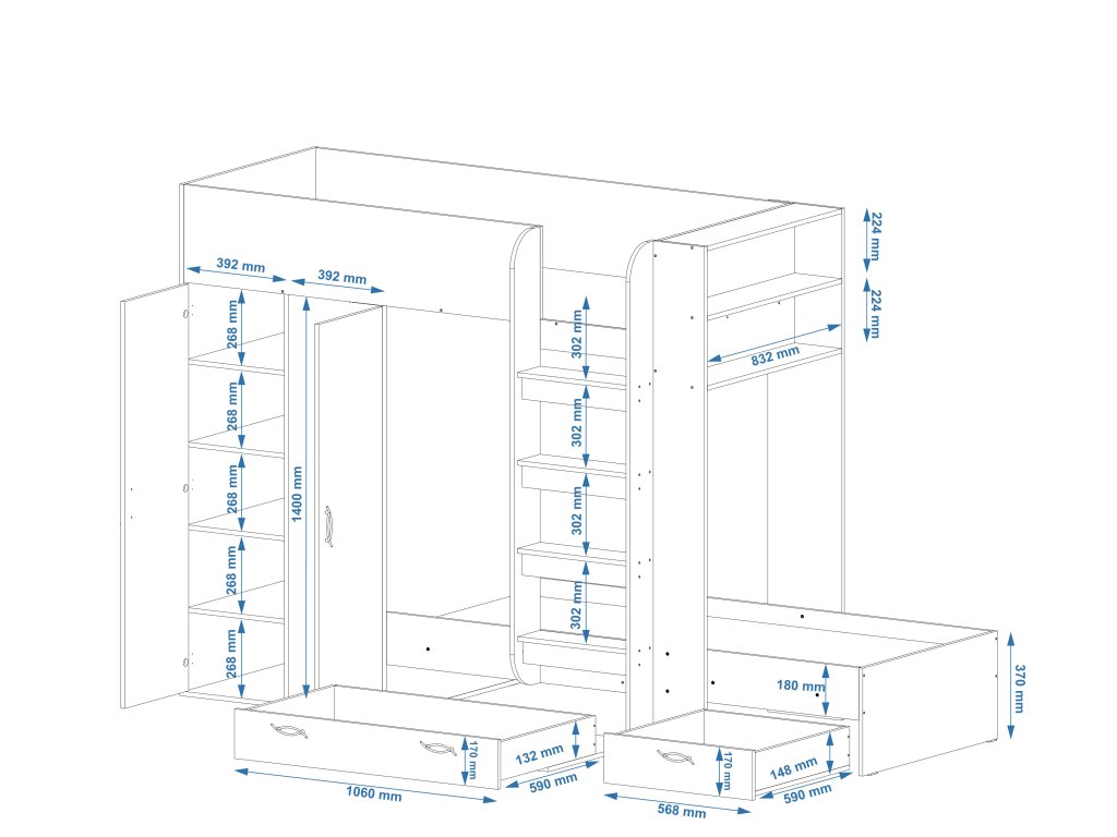 - Úspora místa: Patrová postel s integrovanou skříní a regálem šetří cenný prostor a nabízí praktické řešení pro uložení oblečení, knih či dalších předmětů.