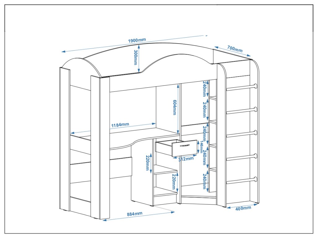 - Úspora místa – Patrová postel ORBITA efektivně využívá prostor díky konstrukci s psacím stolem a šatní skříní v jednom.