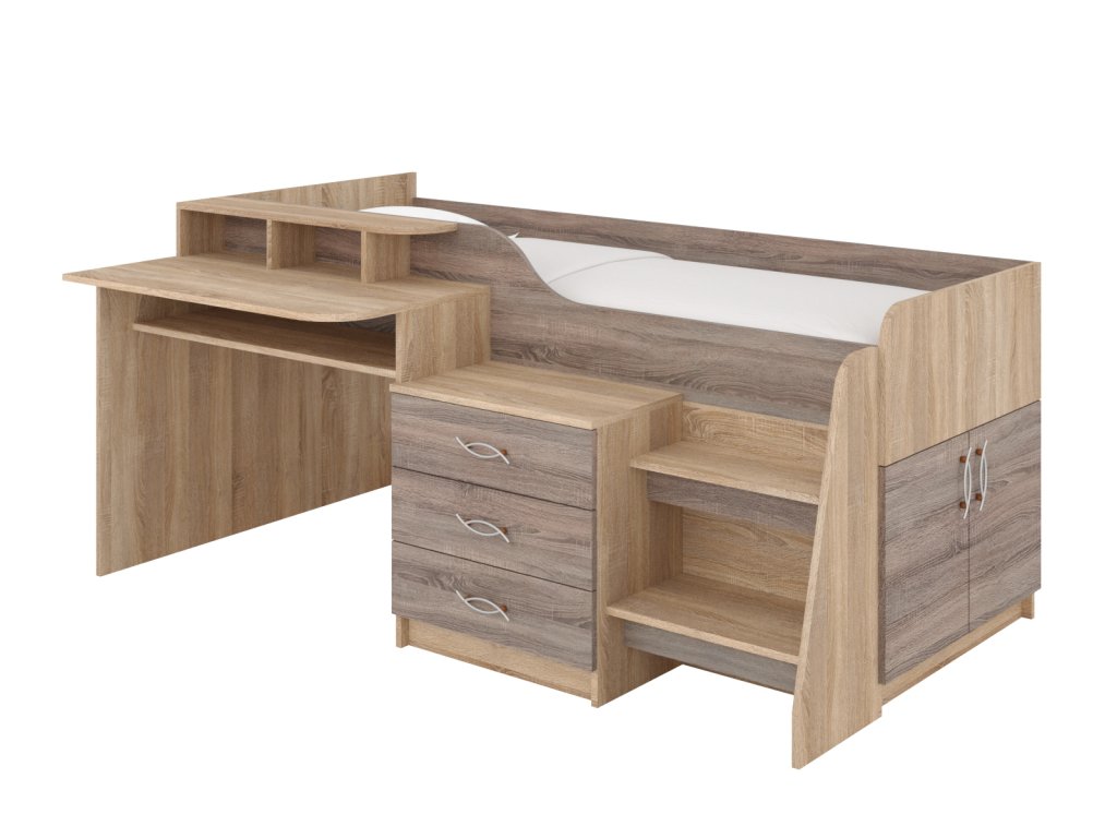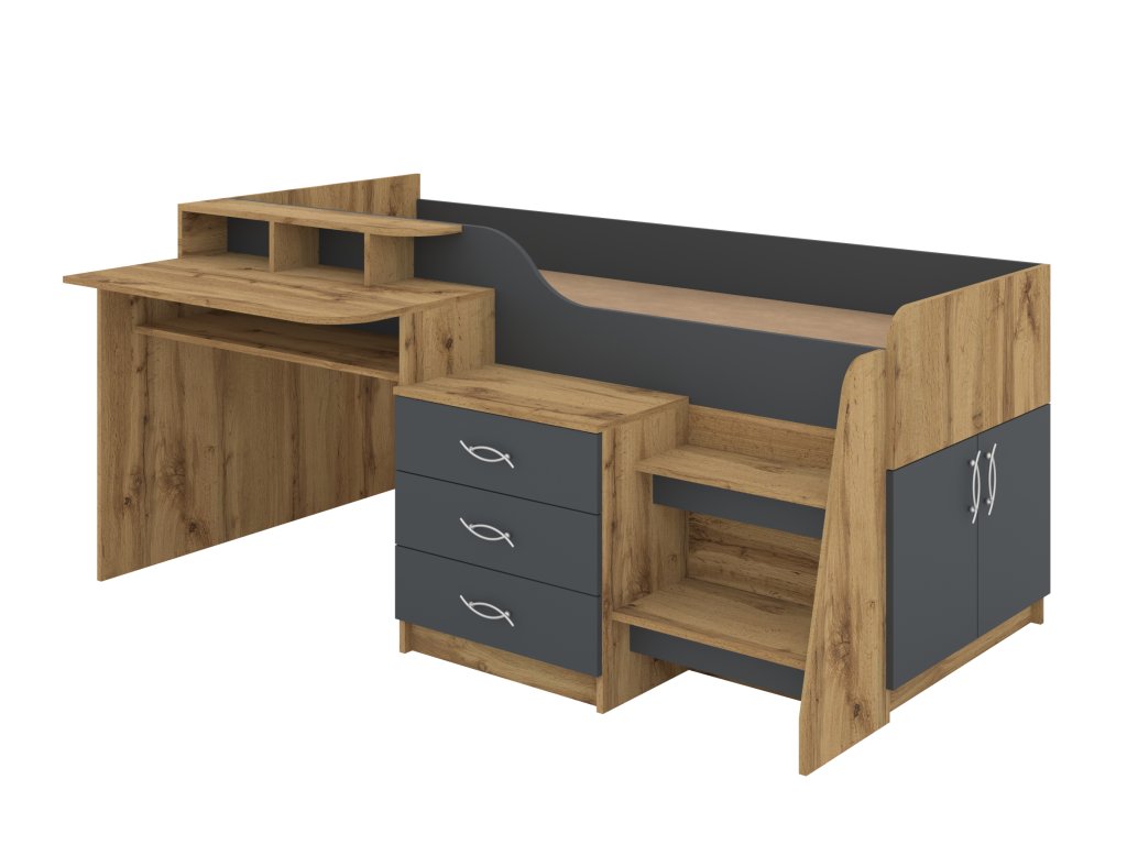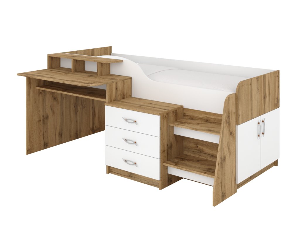 - Prostorově úsporná: Zvýšený design umožňuje uložení psacího stolu, komody a skříňky pod postelí, což šetří místo v pokoji.