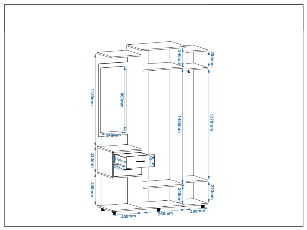 - Praktické uspořádání – Věšák, zrcadlo, skříň s výsuvem a zásuvky, to vše v jednom kuse nábytku pro dokonalý pořádek.