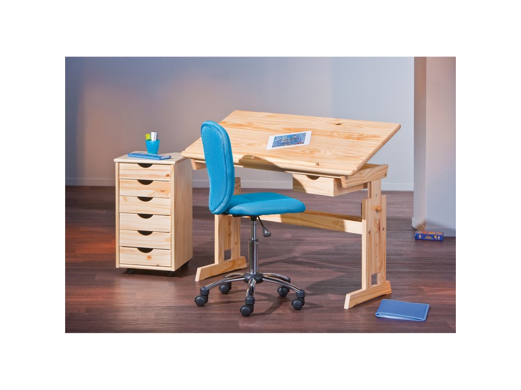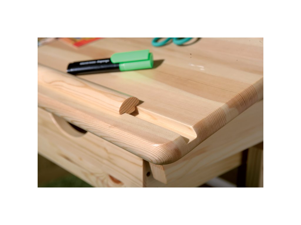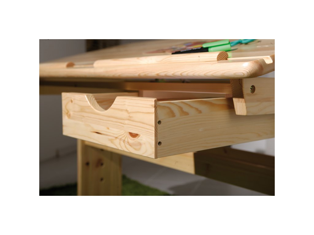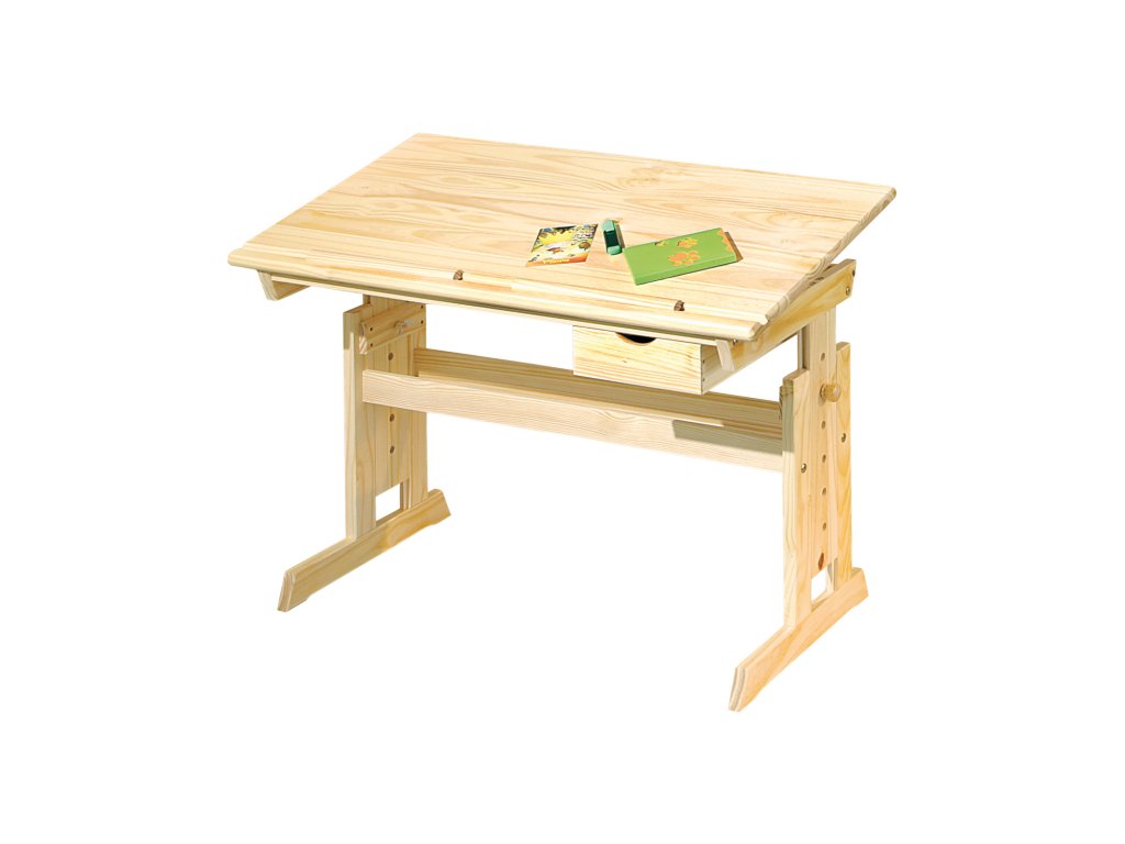 materiál masiv, lakované provedení pracovní deska výškově nastavitelná 63-96 cm, naklopitelná pod pracovní deskou zásuvka a odkládací police