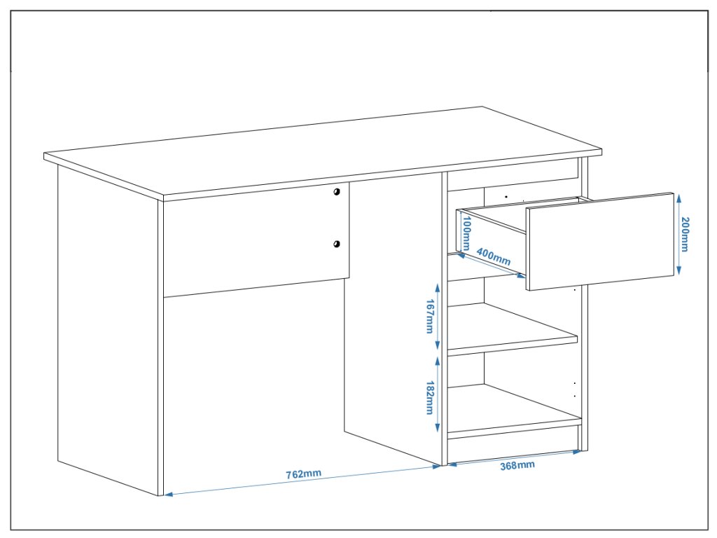 - Funkčnost a organizace: Stůl je vybaven praktickými zásuvkami a skříňkou pro snadné uspořádání dokumentů, kancelářských potřeb a dalších věcí.