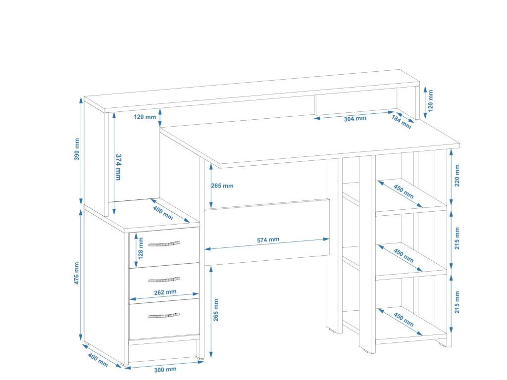 - Praktický design: Stůl je vybavený zásuvkami pro uchování věcí a policovým regálem pro uložení knih, dokumentů nebo dekorací. Vše budete mít na dosah ruky a přehledně uspořádané.
