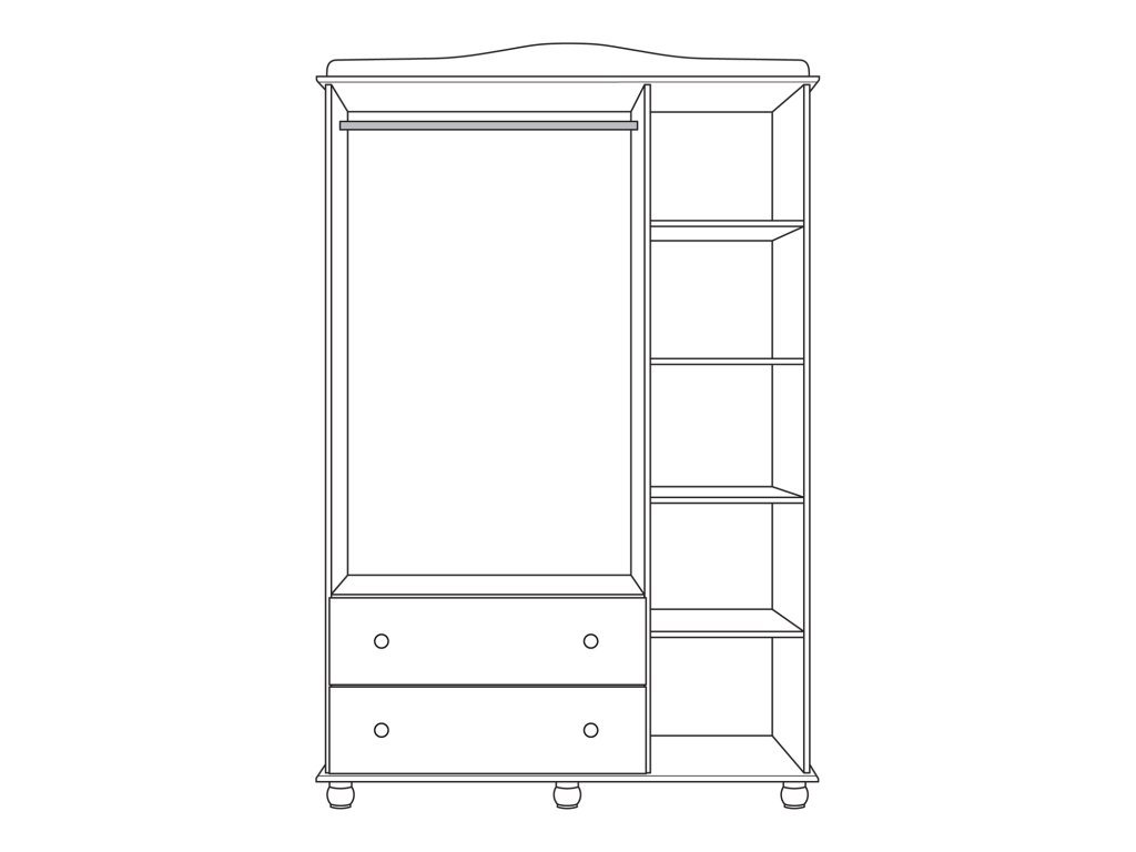 materiál masiv borovice, lakované provedení prostor dělený 2:1, v pravé části 4 police v levé části dveře se zrcadlem, kovová šatní tyč, 2 zásuvky s kovovými pojezdy