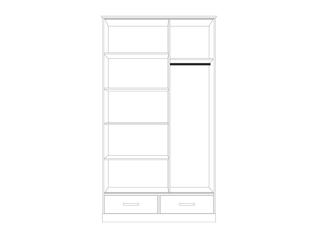 materiál masiv borovice, lakované provedení 2 zásuvky s kovovými pojezdy, 2 posuvné dveře v levé části 4 police, v pravé části 1 police a kovová šatní tyč