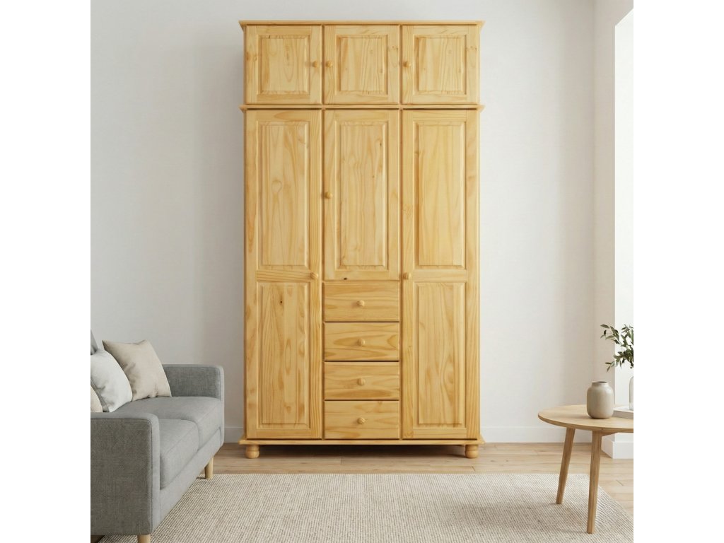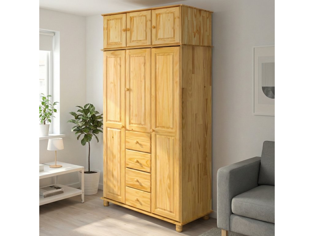 materiál masiv borovice, lakované provedení čtyři zásuvky s kovovými pojezdy v levé části dvě šatní tyče, ve střední části 1 police a v pravé části 3 police doporučený nástavec 8864
