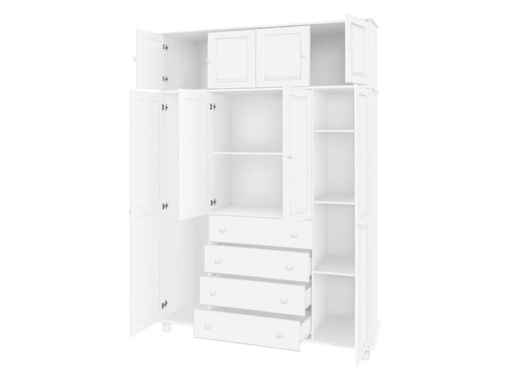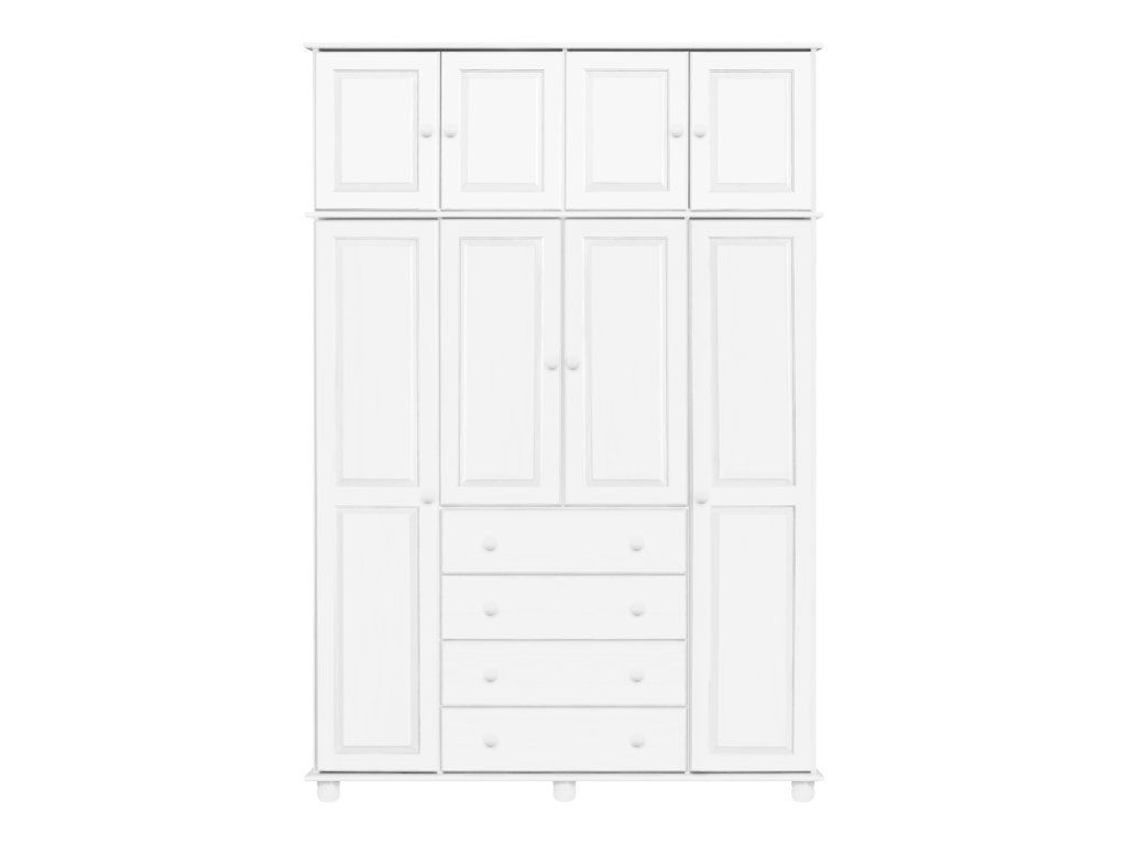 materiál masiv borovice, barevné provedení bílý lak čtyři široké zásuvky s kovovými pojezdy v levé části dvě šatní tyče, ve střední části 1 police a v pravé části 3 police doporučený nástavec 8853B
