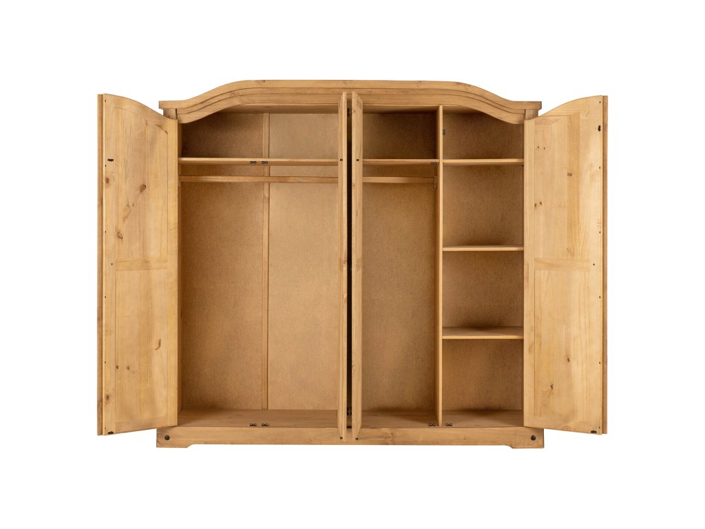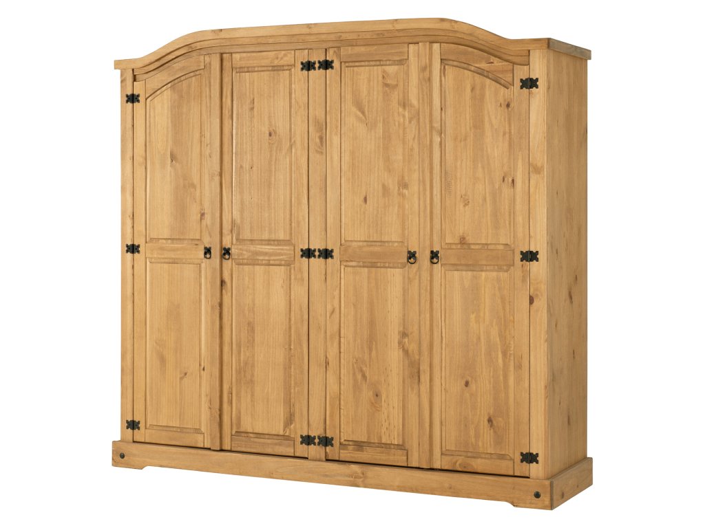 materiál masiv borovice voskovaná v medovém odstínu prostor dělený na polovinyv levé části šatní tyč a police na klobouky v pravé části vlevo šatní tyč a police na klobouky, vpravo 3 police z toho 2 variabilní kovové ozdobné úchytky součást sestavy Corona