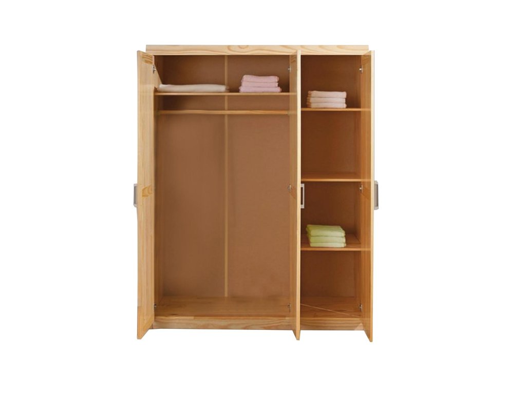 materiál masiv borovice, lakované provedení prostor dělený v poměru 2:1 širší část šatní tyč a police, užší část 3 variabilní police
