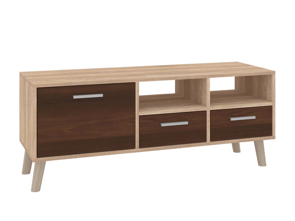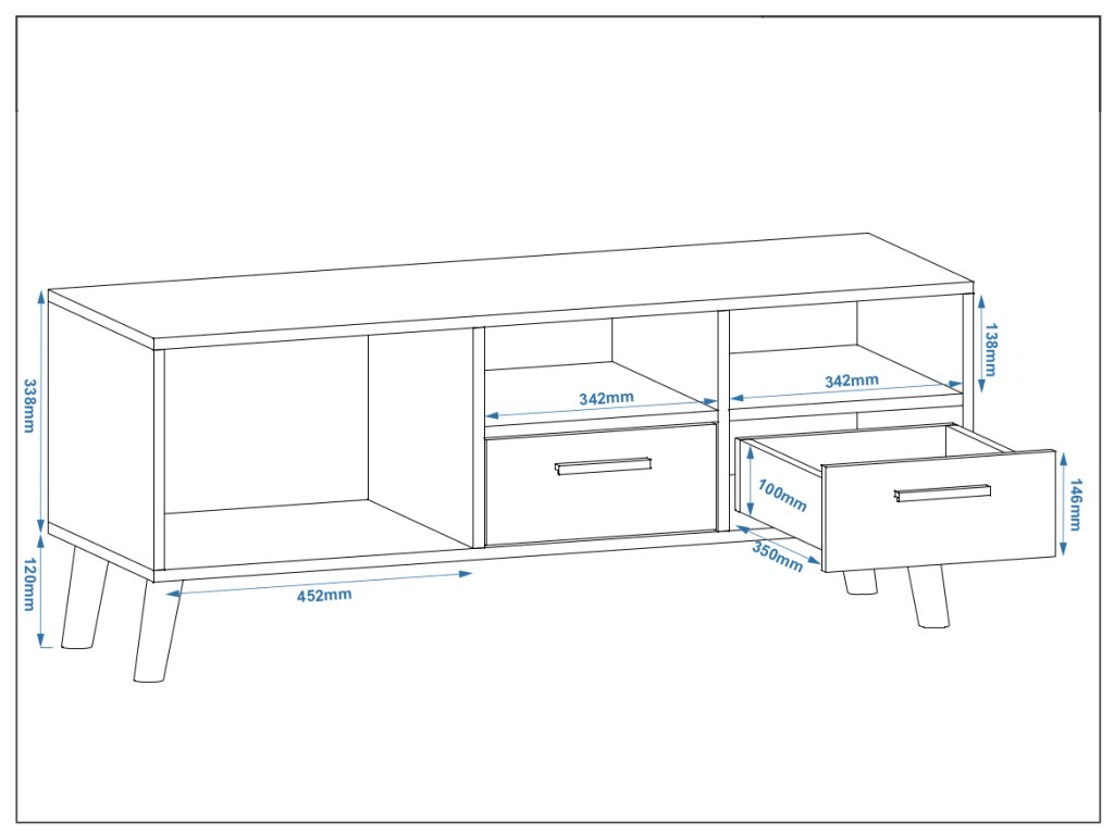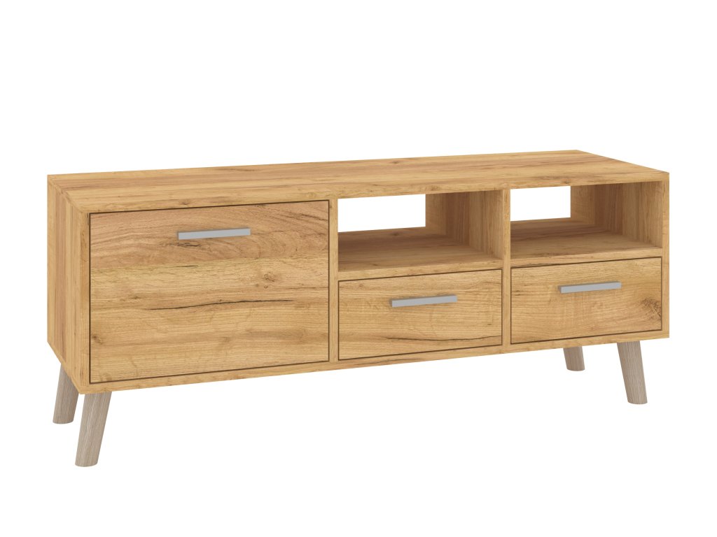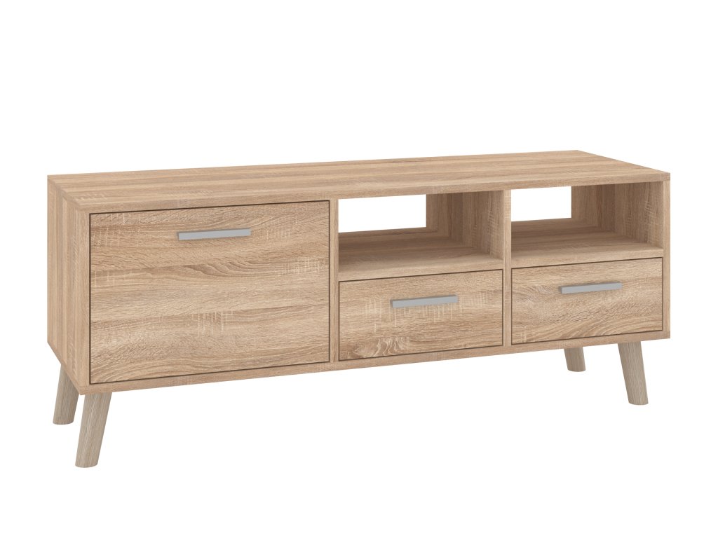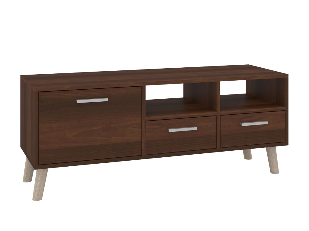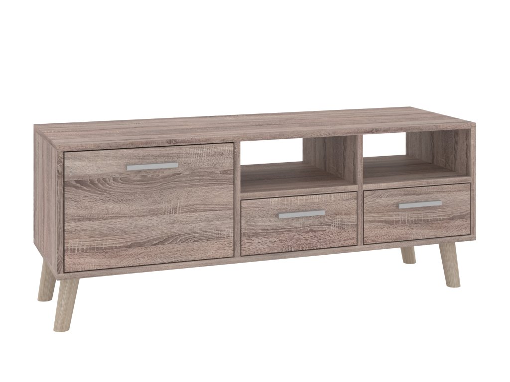 - Praktický úložný prostor: Televizní stolek je vybaven dvěma zásuvkami, dvířky a otevřenými policemi, které vám umožní přehledně uložit vše od elektroniky po dekorační předměty.