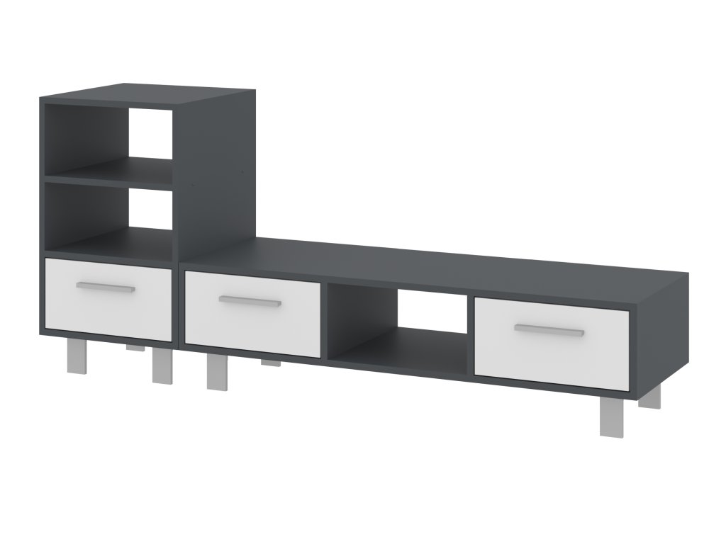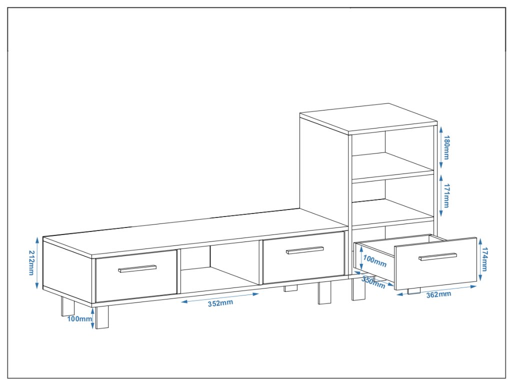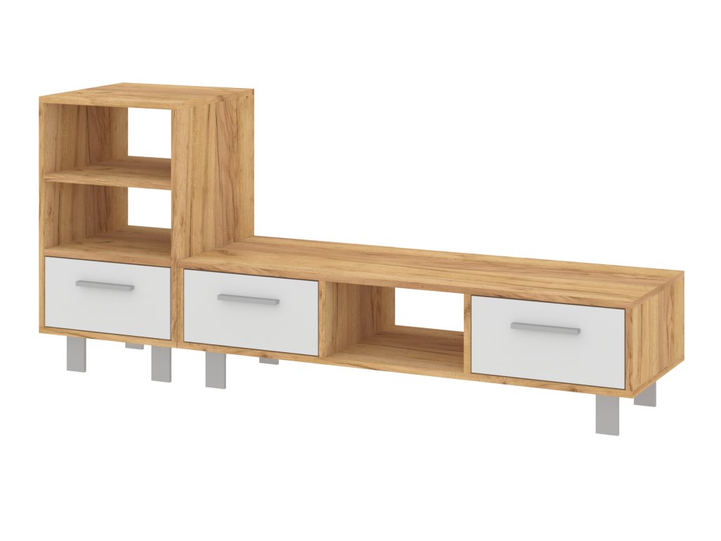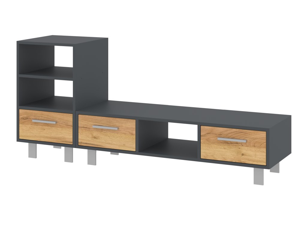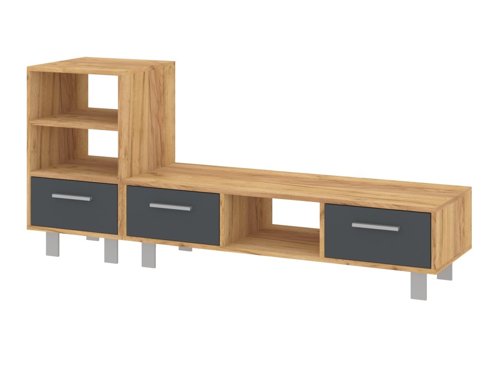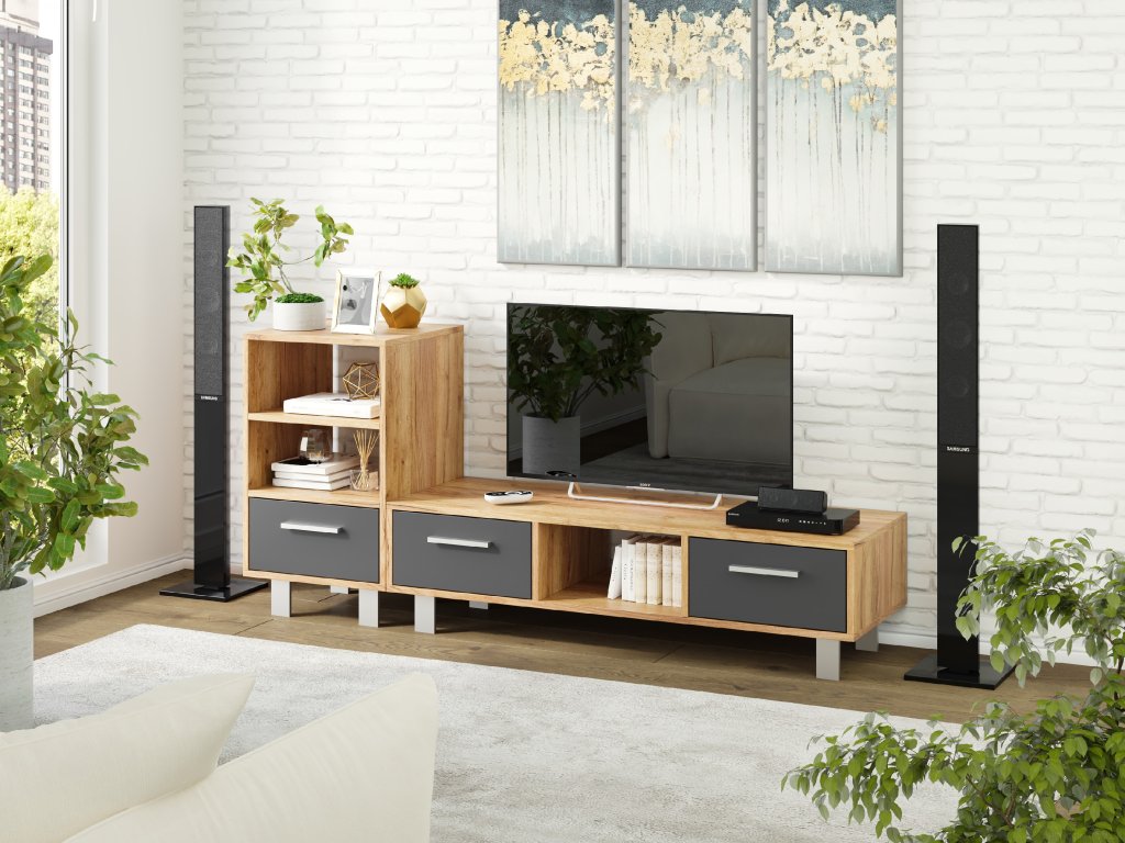 - Praktický úložný prostor: Díky kombinaci zásuvek, otevřených polic a regálu si snadno uspořádáte vše, co potřebujete mít po ruce – od elektroniky až po knihy či dekorace.