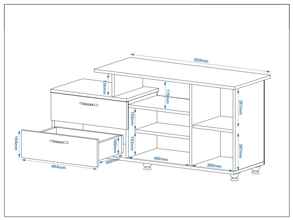 - Prostor pro televizi i úložné prostory: S prostornou horní deskou je ideální pro umístění televizoru. Zásuvky a skříňka poskytují dostatek místa pro vaše přehrávače, kabely, ovladače a další věci.