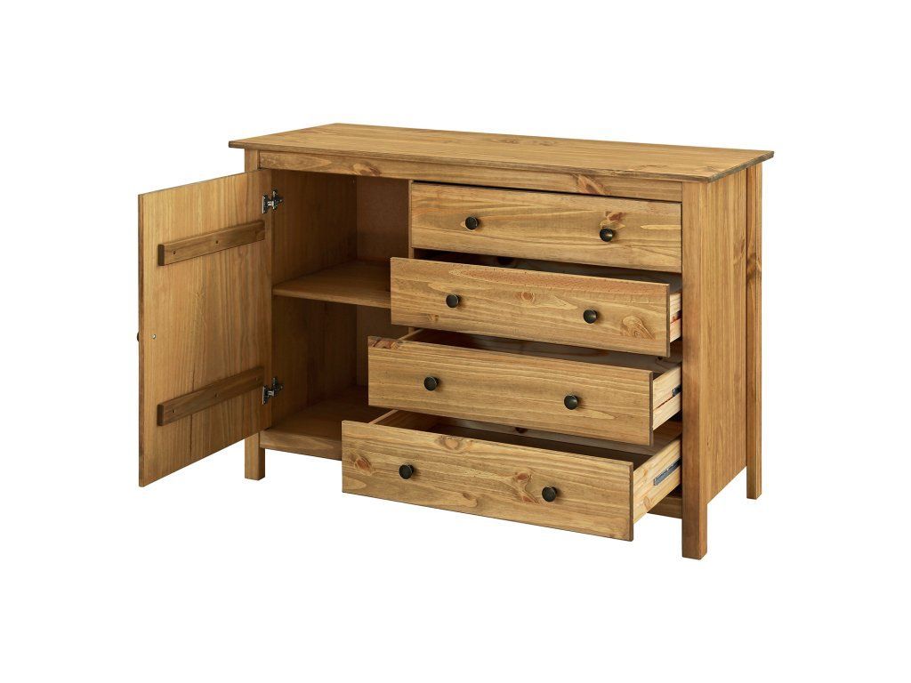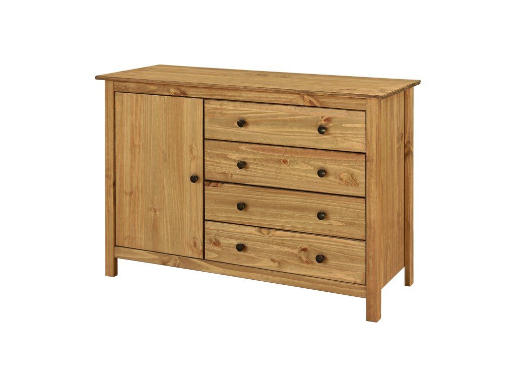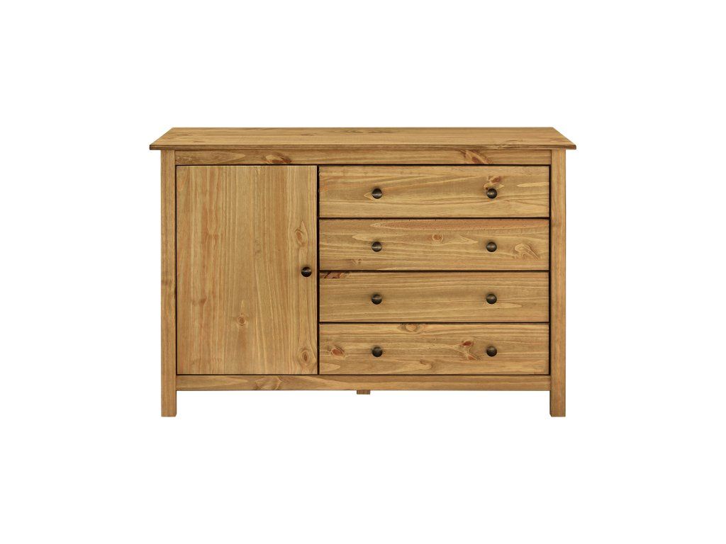 materiál masiv borovice voskovaná v medovém odstínu kovové úchytky v barevném provedení černěná mosaz 1 dvířka a 4 zásuvky s kovovými pojezdy