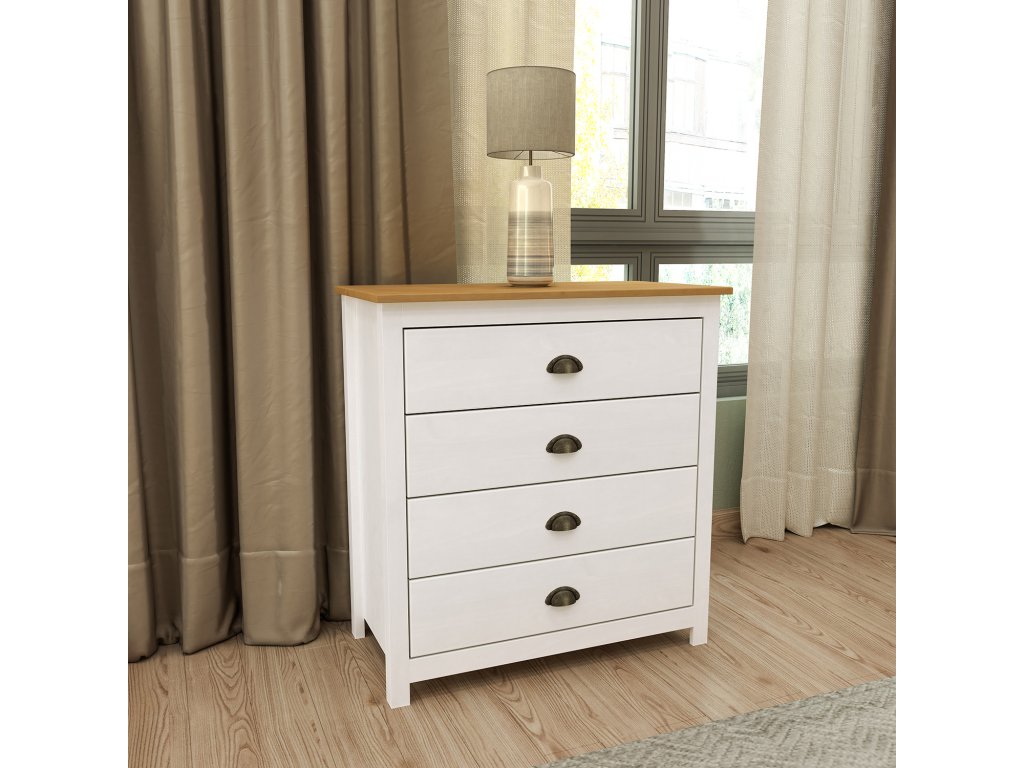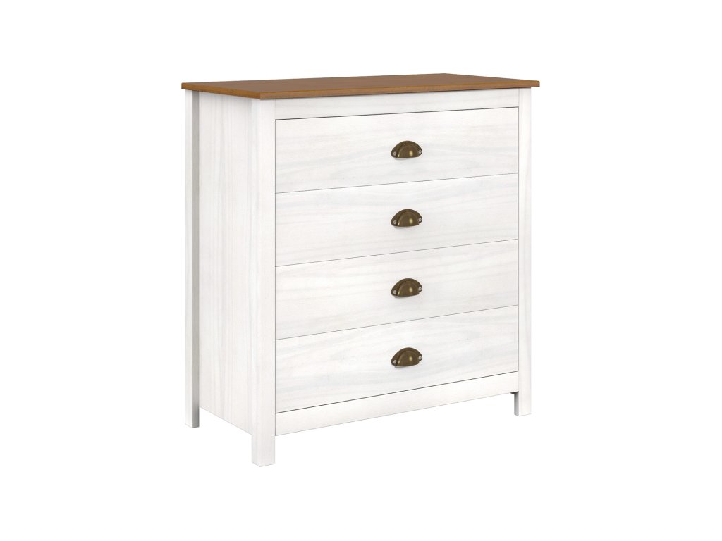 materiál masiv borovice, barevné provedení bílý / hnědý lak čtyři zásuvky s kovovými úchytkami a pojezdy