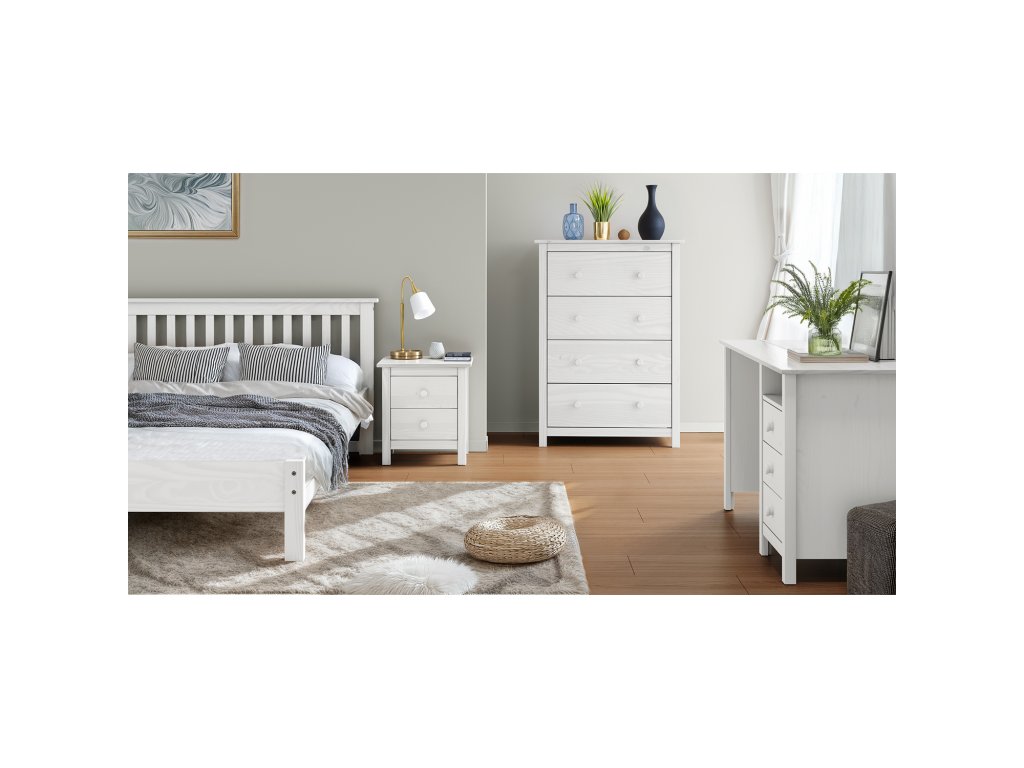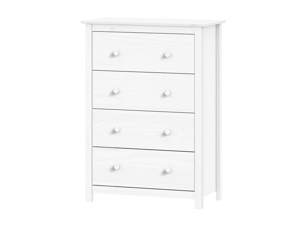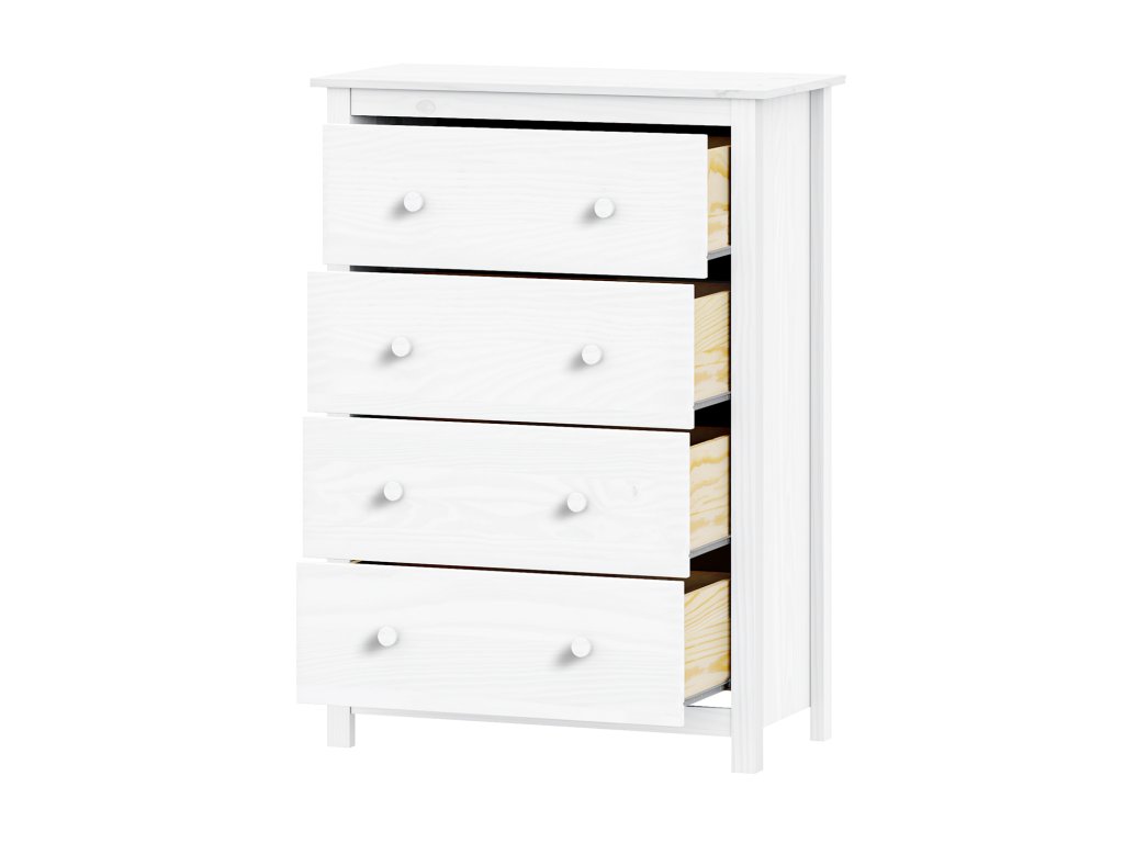 materiál masiv borovice, barevné provedení bílý lak čtyři zásuvky s kovovými pojezdy