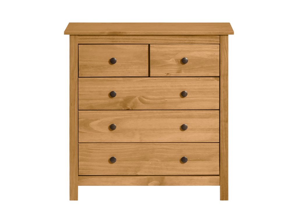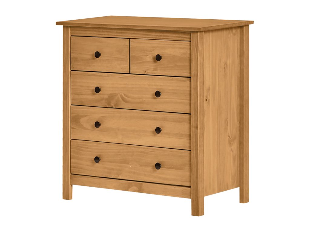 materiál masiv borovice voskovaná v medovém odstínu kovové úchytky v barevném provedení černěná mosaz 2 menší a 3 větší zásuvky s kovovými pojezdy