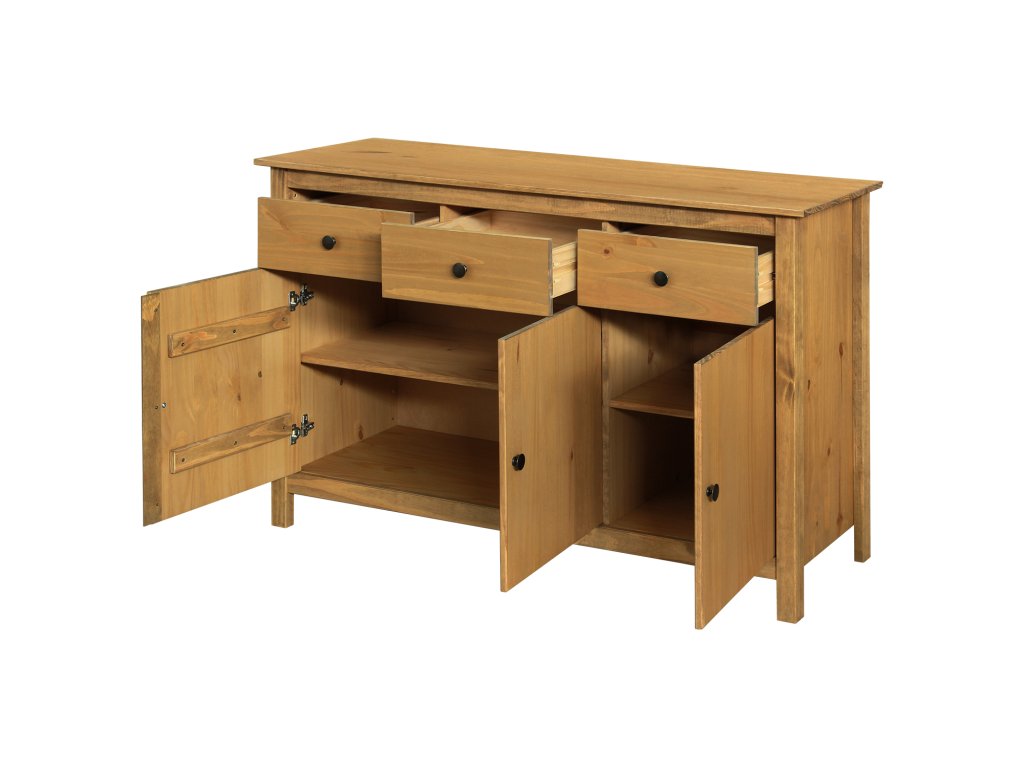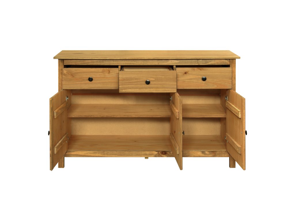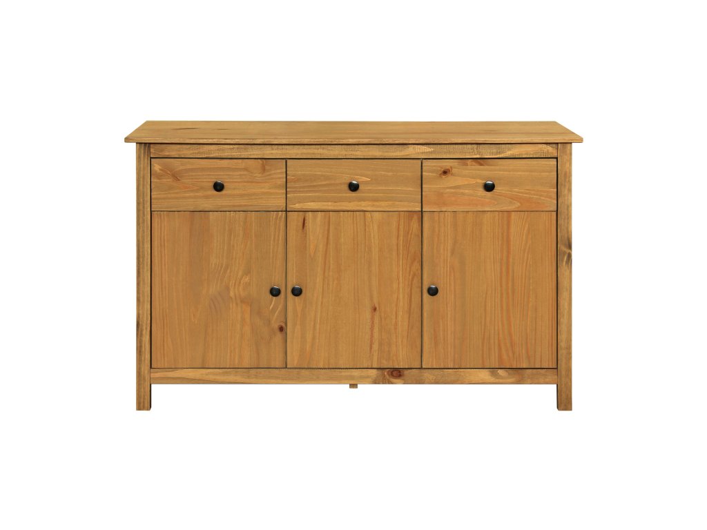 materiál masiv borovice voskovaná v medovém odstínu kovové úchytky v barevném provedení černěná mosaz 3 dveře, 3 zásuvky s kovovými pojezdy vhodný doplněk nástavec TORINO 8063V