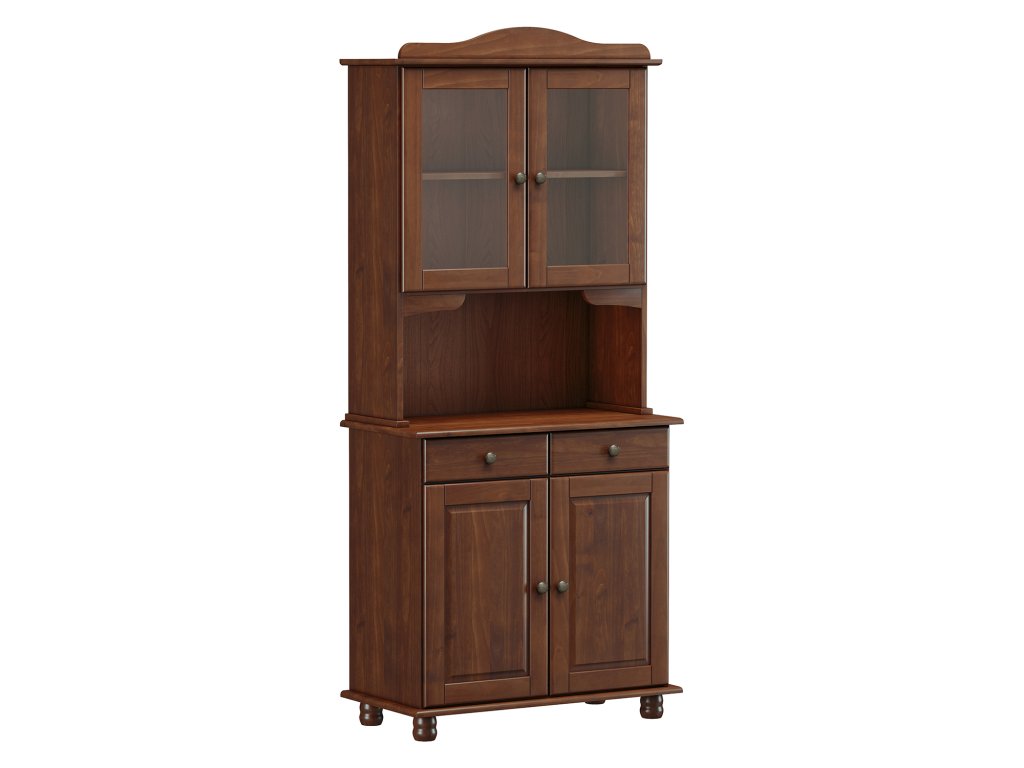materiál masiv borovice, barevné provedení tmavě hnědá v dolní části 2 dveře, 2 zásuvky s kovovými pojezdy v horní části dvoje prosklené dveře