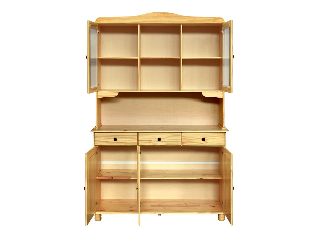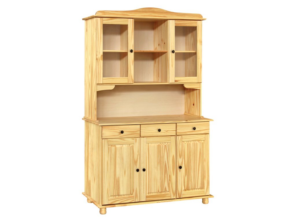 materiál masiv borovice, lakované provedení v dolní části 3 dveře, 3 zásuvky s kovovými pojezdy v horní části dvoje prosklené dveře