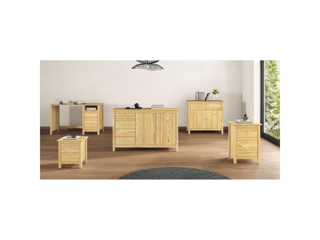 materiál masiv borovice, lakované provedení 2 zásuvky s kovovými pojezdy, 2 plné dveře, 1 police vhodný doplněk nástavec 8096